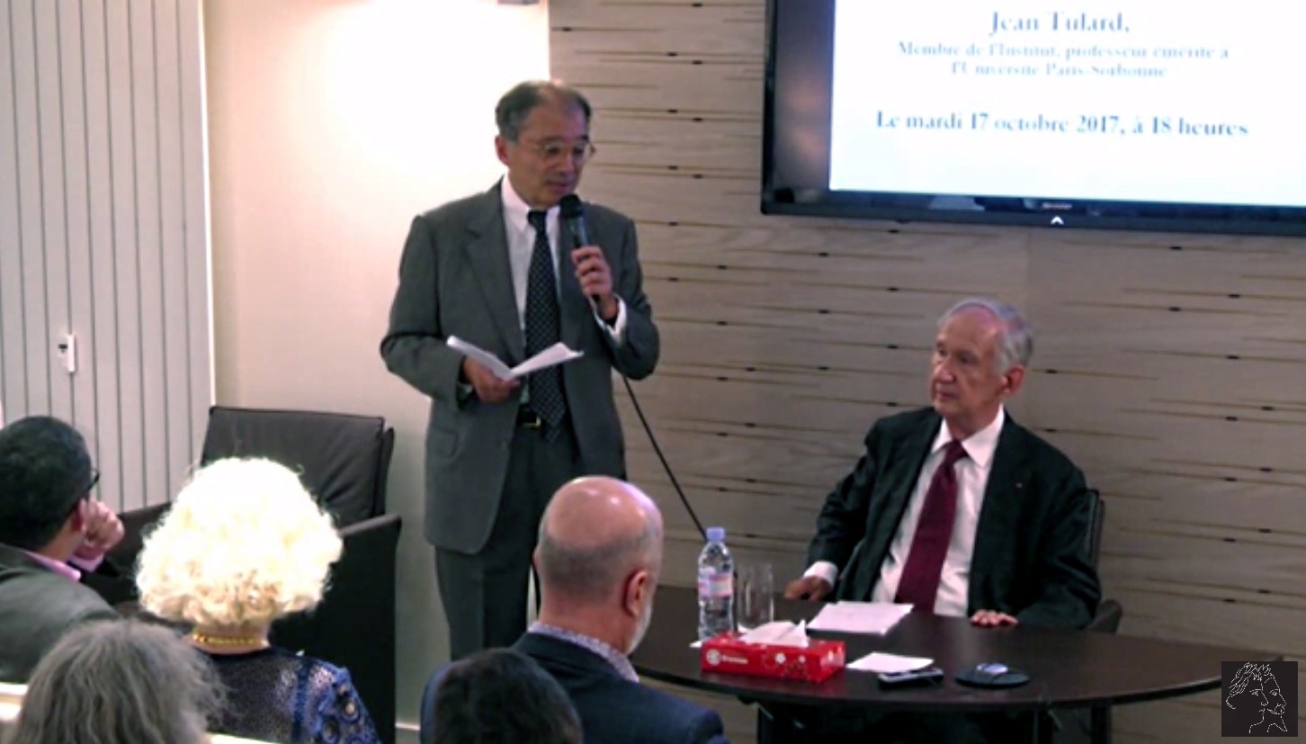 Señoras y señores, buenas noches: entonces, se habrán dado cuenta que esta noche tenemos el gran privilegio de dar la bienvenida a Jean Tulard, finalmente, perdón, dar la bienvenida al señor profesor emérito Jean Tulard del Instituto. Bien, todos ustedes son unos fieles y atentos oyentes de las conferencias del Círculo de Estudios, así que no les haré el número presentando a Jean Tulard y usted, señor profesor, ya tuvimos el placer de darle la bienvenida, así que no le haré el número de presentarlo al Círculo de Estudios de la Fundación, porque normalmente estoy en una situación extremadamente cómoda, en la que no tengo nada que decir, excepto que, salvo que nada es fácil como yo quería: el lunes, las siete conferencias, filmadas y transmitidas en tiempo real en Facebook… entonces es posible que en alguna parte haya algunos extraterrestres que conecten y que no conozcan al profesor Tulard… bueno, y bien para los que conozcan al profesor Tulard, podemos decir, que es la referencia absoluta en términos de competencias napoleónicas. Por otra parte si esta competencia pudiera medirse en talento usted estaría en Sèvres, pero gracias a Dios que está con nosotros. Bien, siendo usted especialista en cine habrá reconocido una copia de una frase de Michel Audiard en “Dans le cave se rebiffe”. Bien después de efectuar unos brillantes estudios en el Louis-le-Grand, fue primero admitido en Historia, usted es igualmente Doctor en Letras y, entre otros, Director de estudios en la Escuela Práctica de Altos Estudios, profesor en la Sorbona y profesor en el Instituto de Estudios Políticos de París, también presidente honorario del instituto Napoleón y Presidente Honorario de la muy amigable Asociación de los Amigos del museo Murat.