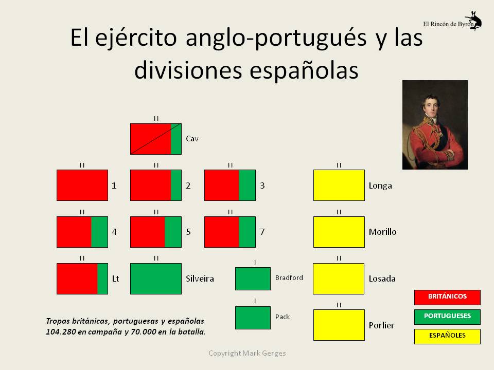 También hay alrededor de 6.000 españoles leales que lucharán por los franceses; estos son los buenos Guardias Reales del rey José, tanto guardias de pie como guardias de caballo, por lo que los franceses tendrán alrededor de 68.000, a pesar de Wellington cuenta con 104.000, cuando en realidad se sitúa sobre el campo de batalla, los números en el campo en sí, son aproximadamente iguales a 1:1.