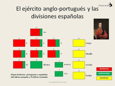 También tienes el cuarto ejército español y otro de estos tipos extraños de organizaciones. El ejército español que está operando con Wellington se mantendrá apartado durante la mayor parte de la pelea. La primera división aquí, del coronel Longa es en realidad una división guerrillera y podemos hablar de las guerrillas durante el turno de preguntas y respuestas, porque tenemos que pensar qué significa eso ser una división guerrillera. Tienen regimientos de caballería, tienen regimientos de infantería, tienen baterías de artillería y sin embargo están operando como una división estándar, como lo sabríamos a lo largo de todo esto en la línea de batalla durante toda la pelea y realmente pone en duda cómo clasificas esta guerra de guerrillas que los franceses están peleando. Cuando miras los números, hay alrededor de 104.000 fuerzas aliadas en la campaña, de las cuales cerca de 70.000 estarán disponibles en la Batalla de Vitoria. El resto de ellas asegurarán el bloqueo de las líneas de comunicación de las fuerzas francesas y en otras partes de la Península.