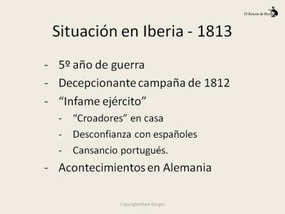 El otro aspecto es Portugal. Portugal tiene el país en el que realmente no hablamos de lo mucho que ha sufrido a lo largo de esta guerra. Ha visto invasiones francesas, tres invasiones francesas diferentes, tropas británicas estacionadas allí durante casi cinco años y en este momento se están cansando de los británicos. Comenzarán allí muchos de los oficiales hablarán sobre cosas que dicen que los españoles preferirían matar a soldados británicos que matar a un perro salvaje y que los campesinos portugueses anden con cuchillos y que sepan cómo usarlos y entonces la relación con sus dos aliados no es tan buena. El otro aspecto que continuará en la primera parte de 1813 es con Napoleón en el centro de Alemania. Diciembre de 1812 Napoleón regresa de Moscú. Atraviesa al otro lado de la frontera, va con 600.000 soldados en junio de 1812, llega a Moscú, regresa y regresa a su imperio con 30,000 soldados, 570,000 han desaparecido. Y realmente los Aliados en este momento, la sexta coalición, piensan: ¡Oh! él está casi contra las cuerdas, ¡cómo podría posiblemente recuperarse de este tipo de pérdida! Y en los primeros cinco meses de 1813, Napoleón logrará una increíble y sorprendente recuperación de su ejército, va a sacar a los soldados de España aproximadamente 100.000, particularmente caballería, pero también infantería, va a sacar a los artilleros de las naves de su armada, llamará antes a los graduados de la academia militar, llevará a los Gendarmes montados, a la Policía Montada al ejército y él saldrá en mayo de 1813 y de repente tendrá un nuevo ejército de 250.000 hombres: él lucha contra los prusianos y los rusos y otras dos batallas en mayo de 1813, los golpea y Europa está absolutamente aturdida, ¿cómo puede Napoleón que ha perdido todo este ejército, regresar cinco meses después con un ejército que es lo suficientemente bueno como para vencernos de nuevo?. Y van a pedir un armisticio y así estarán a medida que avancemos en el verano de 1813. Europa se encuentra en una situación de guerra, pero ahora no se lucha porque ven lo que está pasando. Lo que están tratando de hacer es convencer a Austria para que entre al lado de los aliados. Recuerden que Austria es el suegro de Napoleón, se había casado con una princesa austriaca, por lo que Austria es supuestamente neutral, pero los aliados están tratando de ponerla de su lado, por lo que este es el contexto de lo que está pasando cuando esta campaña comienza.