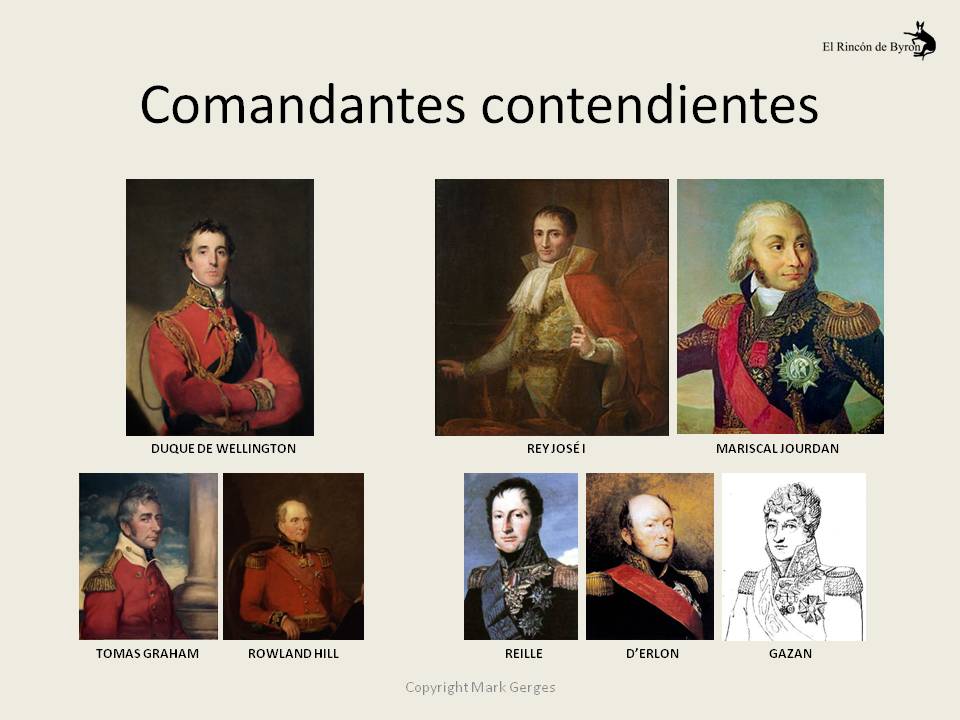 Debajo de él, acabo de marcar a dos de los principales comandantes que desempeñarán un papel en esta campaña: uno es el Teniente-general Thomas Graham, el otro es Rowland Hill. Hill es relativamente joven, tiene cuarenta y un años, muy, muy buena reputación, un sólido comandante y una de las cosas, es que se le conoce como Daddy Hill, sus soldados lo llaman Daddy Hill porque él les brinda atención para asegurarse de que están bien alimentados y cuidados. La otra persona aquí, Thomas Graham, personaje interesante, no se une al ejército para hasta los 42 años, en la batalla de Vitoria tiene 65 años, uno de los comandantes más antiguos en el campo de batalla. Es un agricultor exitoso en 1792, en Escocia, su esposa está enferma, su médico dice que la llevara al sur de Francia para que pueda recuperarse por su clima, pero van a Francia y ella muere. Si bien estos son malos tiempos para él, es justo cuando la Revolución Francesa comienza a entrar en sus fases violentas, por lo que cuando regresa con el cuerpo, se encuentra con algunos revolucionarios franceses que quieren ver si está escondiendo armas en su ataúd. y básicamente arrojan sus cuerpos al suelo y esto indigna tanto a Graham que una vez que regrese a casa se ofrecerá voluntario para el ejército y luego obtendrá una comisión, y ascenderá en las filas, por lo que en este período es Teniente-general. A pesar de que le tenemos con 65 años, él es muy vigoroso y un comandante muy, muy bueno.