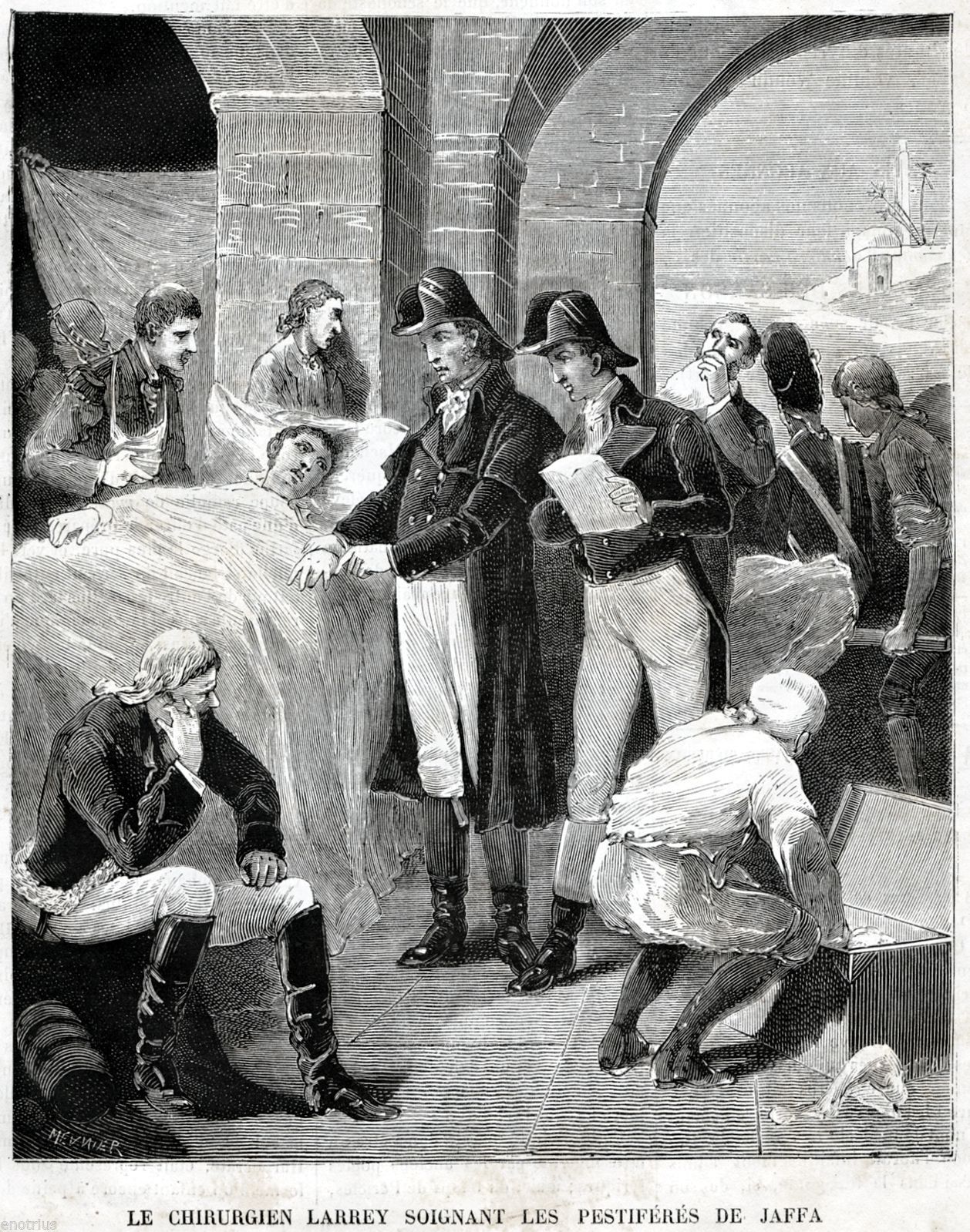 1799 – En febrero las tropas marchan hacia Siria, con la vanguardia mandada por el general Reynier. Se produce el primer combate en El-Arich, con 300 bajas francesas. El 28 de febrero Napoleón llega y se asedia el fuerte de la ciudad. A la rendición, Napoleón ordena a Larrey acondicionar el interior y desinfectar las salas y descubren un grupo de prisioneros heridos afectados por la peste, lo que confirmaba también su existencia entre la guarnición. Por la falta de provisiones encontradas sigue la travesía por los desiertos. El ejército, tras un breve combate de caballería, llega a Gaza.