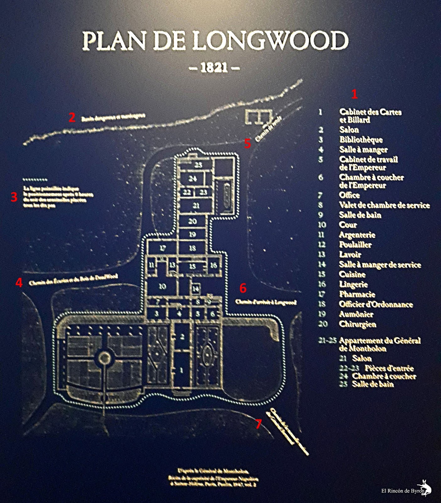 1. Leyenda: 1. Gabinete de los mapas y billar; 2. Salón; 3. Biblioteca; 4. Comedor; 5. Gabinete de trabajo del Emperador; 6. Dormitorio del Emperador; 7. Office; 8. Ayuda de cámara de servicio; 9. Cuarto de baño; 10. Corte; 11. Cubertería; 12. Gallinero; 13. Lavadero; 14. Comedor del servicio; 15. Cocina; 16. Cuarto ropero; 17. Farmacia; 18. Oficial de ordenanza; 19. Capellán; 20. Cirujano; 21-25. Apartamento del general de Montholon: 21. Salón; 22-23. Salas de entrada; 24. Dormitorio; 25. Cuarto de baño.