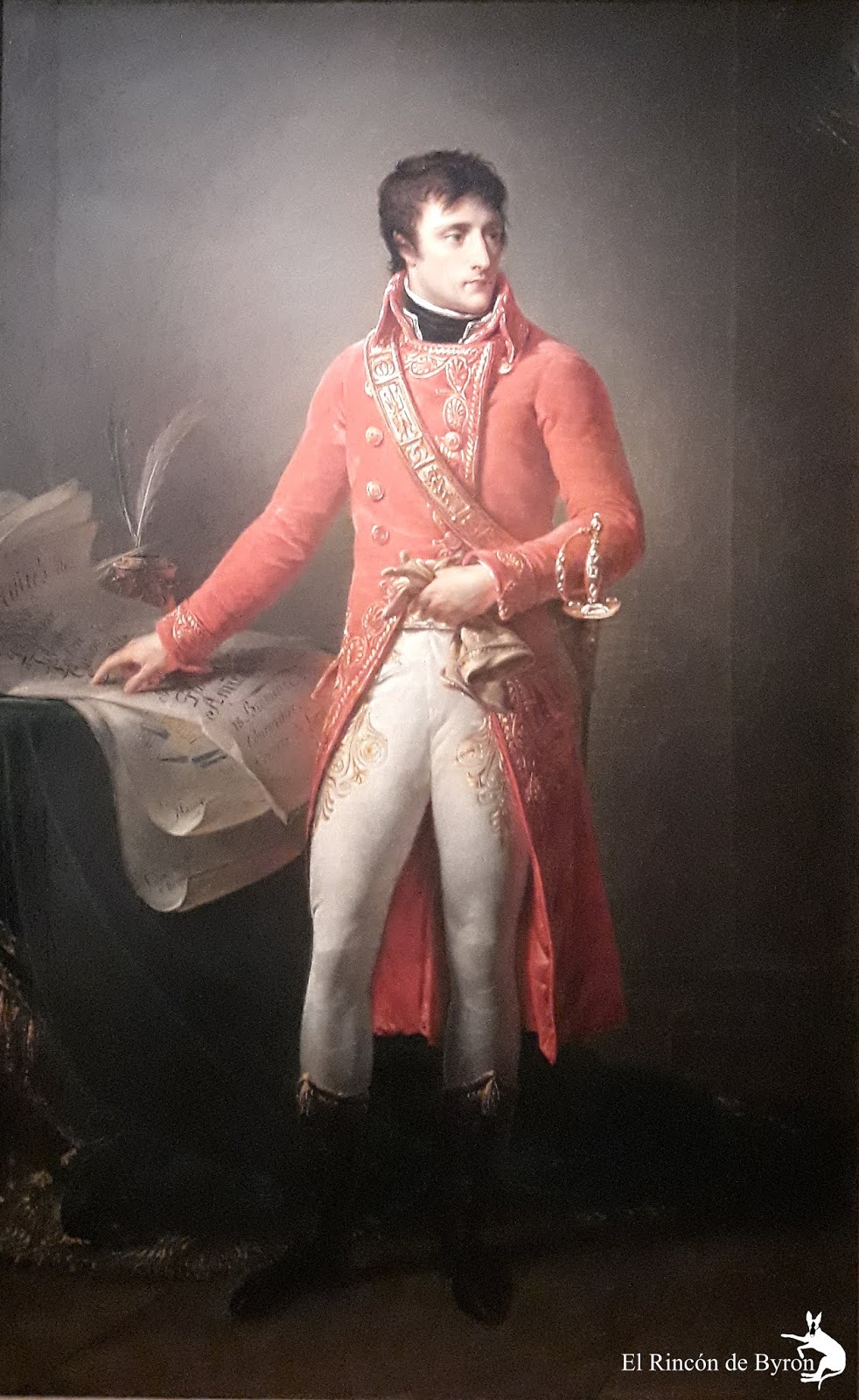 01. Napoleón Bonaparte viste el uniforme rojo de los cónsules de la República. Una bandolera de oro cruza su torso para sostener la espada, por entonces símbolo de mando. Agarra firmemente su par de guantes. Evoca al hombre de acción y le da una imagen dinámica.