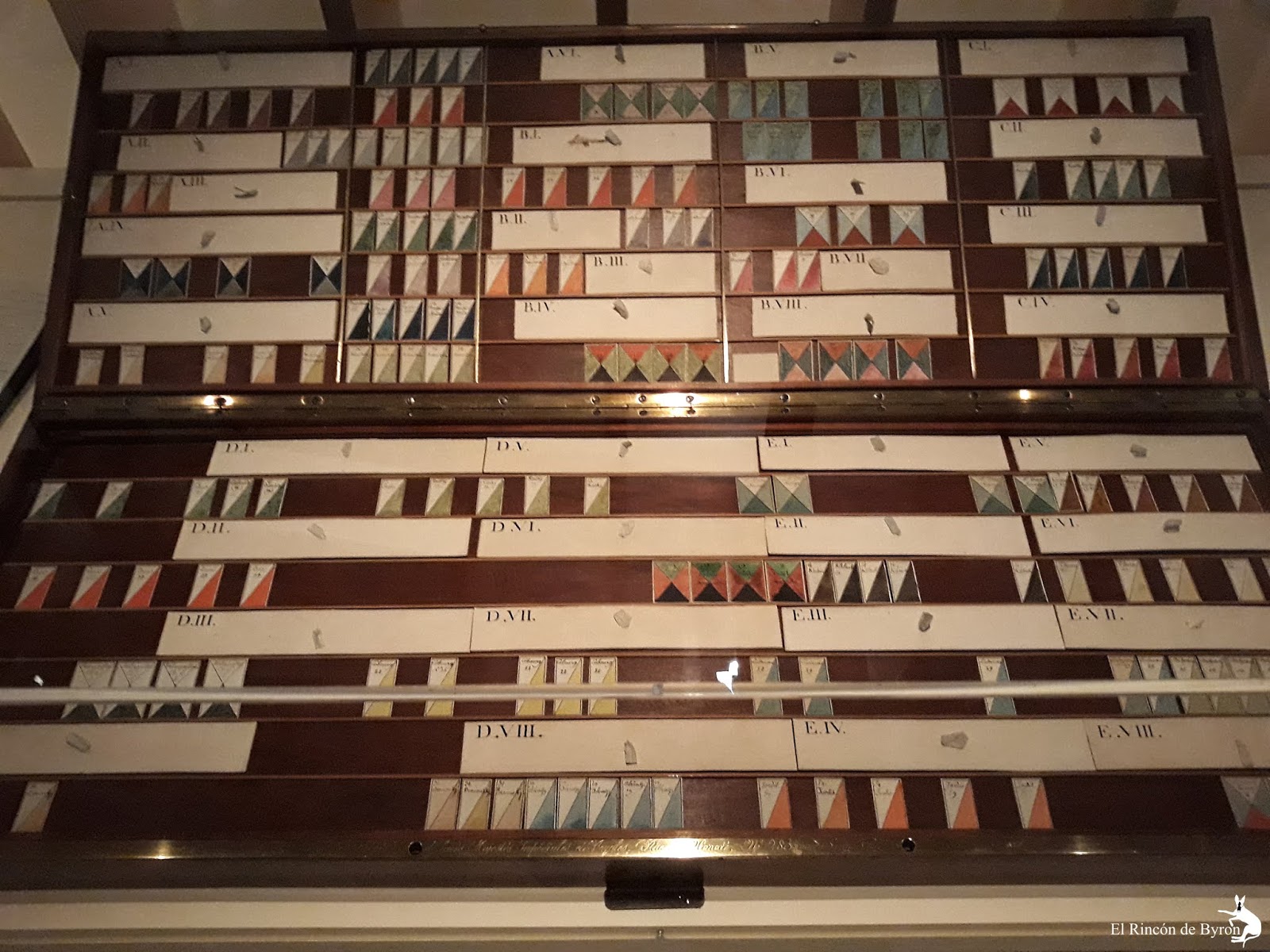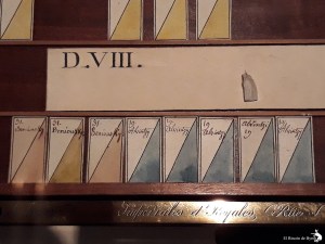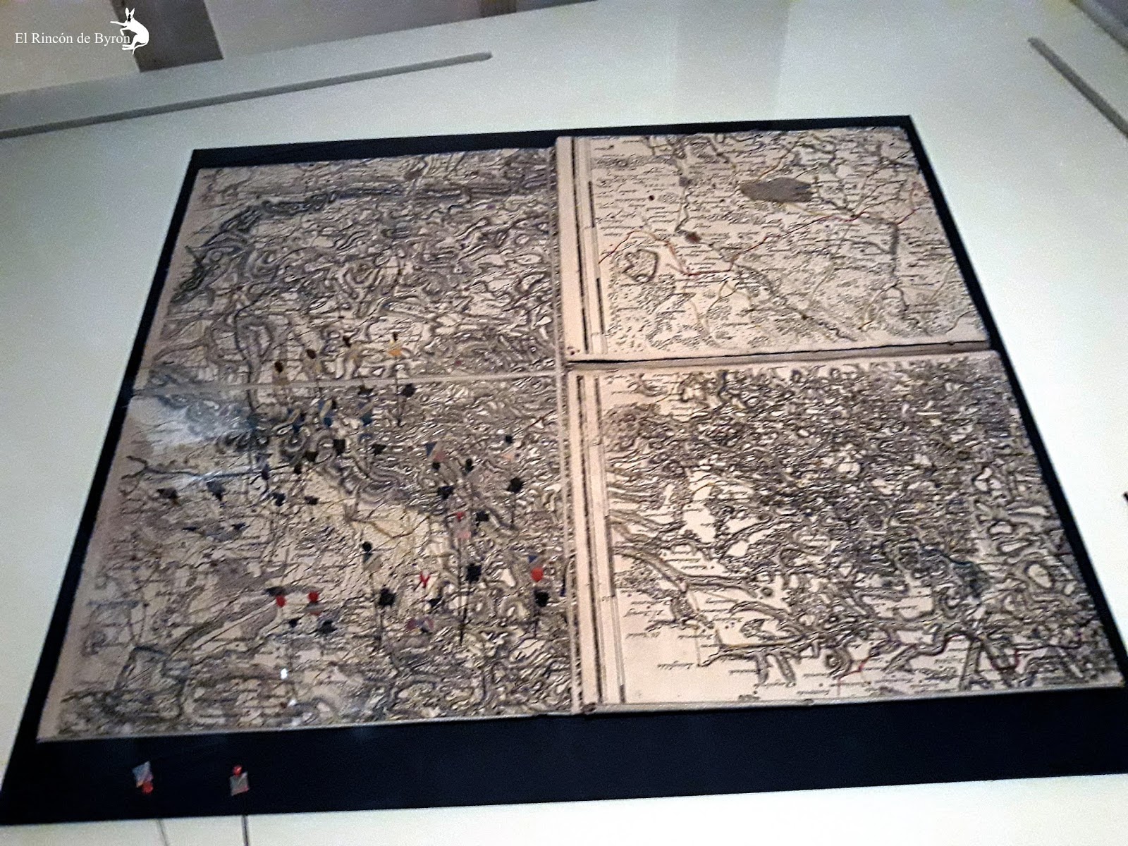 Este mapa lleno de alfileres pertenecía al hijastro de Napoleón, Eugenio de Beauharnais. Los alfileres, de diferentes formas y colores señalan el emplazamiento de las tropas aliadas o enemigas sobre los mapas. En Souvenirs d’un vieux soldat belge de la garde impériale, el coronel Scheltens describe a Napoleón trabajando: «Un gran mapa estaba desplegado sobre el parquet […] De rodillas sobre este mapa, Napoleón plantaba alfileres españoles con cabeza de cera de dos colores diferentes.»