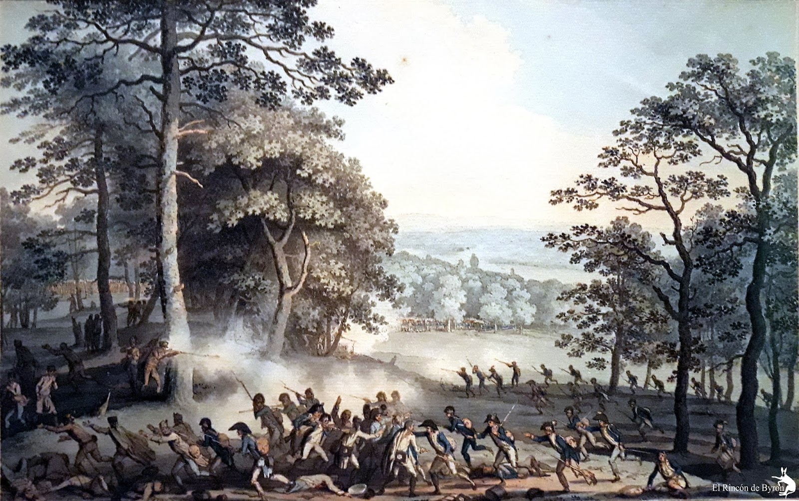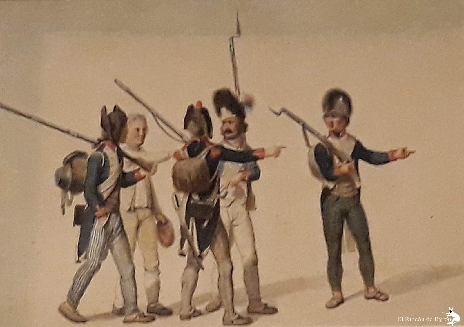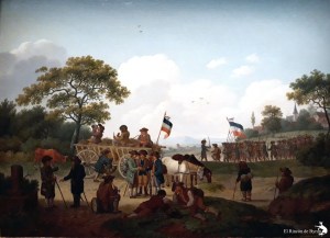 Los soldados preguntan el camino a un civil. Su atuendo descuidado y desparejado ofrece una imagen edificante de los ejércitos de la joven República. Durante algunos años, los nuevos conscriptos vestidos de azul, como aquí, se codearon con veteranos que todavía usaban el uniforme blanco del ejército del Rey.
