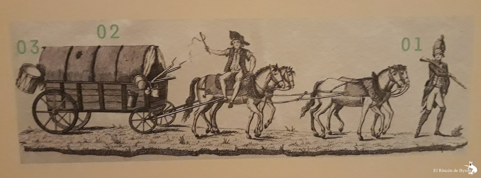 02. El carro contiene pólvora negra (explosiva), balas de cañón, rifles que terminan con un punta llamada bayoneta, herramientas, comida para hombres y caballos.