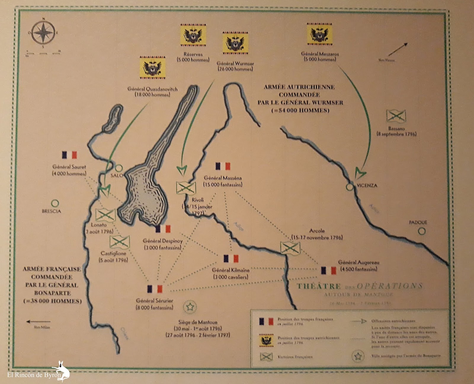 En mayo de 1796, el general Bonaparte cerca a 5.000 austriacos en la fortaleza de Mantua. Teme un contraataque que pueda socorrer a la villa. Sin conocer las intenciones del enemigo, adopta un dispositivo de estratégico a la espera. Reparte sus fuerzas para controlar el teatro de operaciones, guardando entre ellas una distancia razonable para permitir a cada división reforzar rápidamente a las otras en caso de ataque. Mantua capitula en febrero de 1797 después de la victoria de Bonaparte en Rivoli (13 y 14 de enero de 1797)