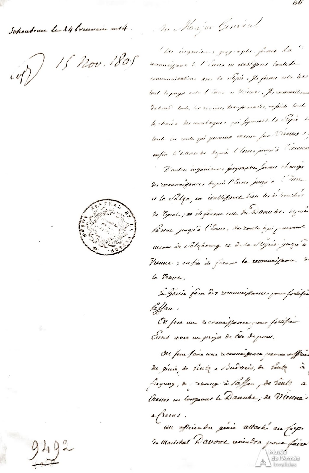 Carta de Napoleón al mariscal Alexandre Berthier, ministro de la Guerra, ordenándole encomendar a