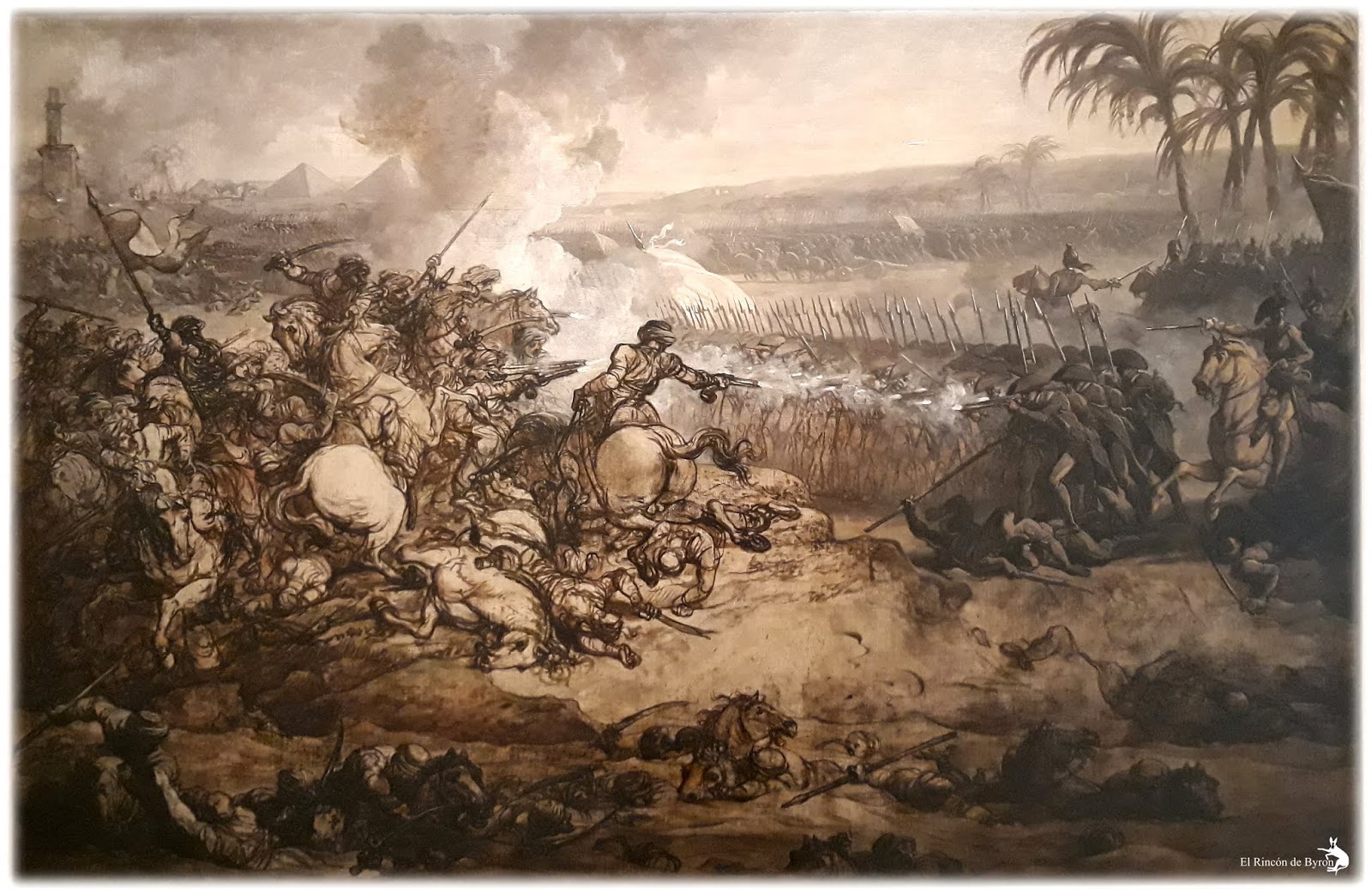 “Todos los mamelucos, montados sobre caballos magníficos, ricamente enjaezados en oro y plata, envueltos en colgaduras de todos los colores […], lanzados a pleno galope, lanzaban los gritos que rompían el aire, parecían tener que aniquilarnos […] bajo los pies de sus caballos. Así, desde que se ordenó hacer fuego, fue ejecutado con prontitud y precisión […] de suerte que en el borde de nuestros cuadros se ofrecía la visión de cadáveres pudriéndose en sus ropajes”