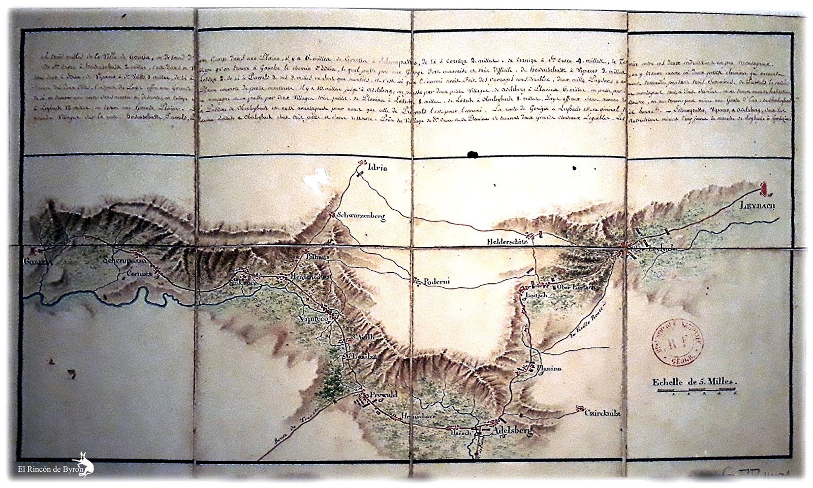 Mapa de reconocimiento militar de la ruta que va de Gorizia a Laibach (Ljubljana) Hacia 1809 Dibujo con tinta marrón y acuarela sobre papel |