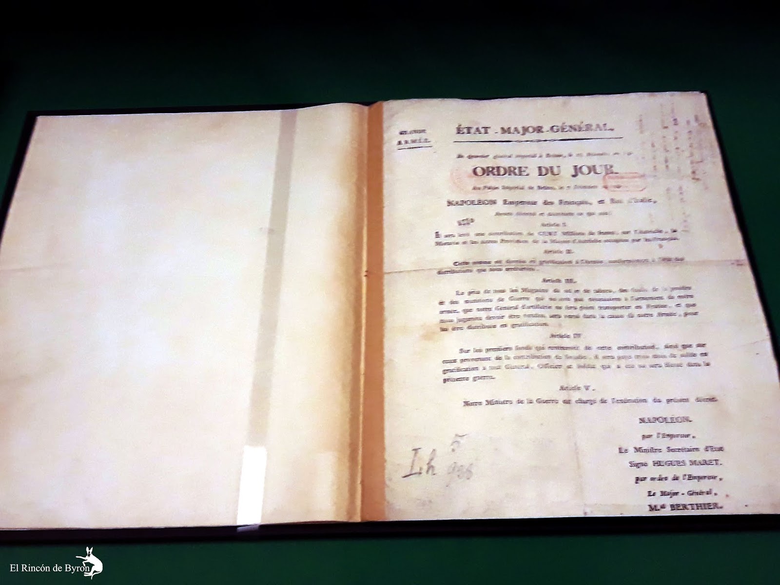 Esta orden del día reproduce un decreto imperial del 7 de frimario del año XIV. Después de Austerlitz, Austria debe indemnizar con 100 millones de francos, que el Emperador destina prioritariamente a la gratificación de los soldados heridos durante la campaña.