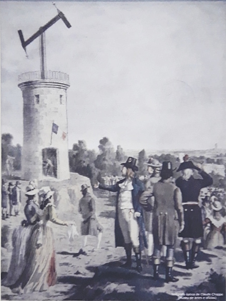 On the left is an engraving showing a French telegraph by Chappe, named after its inventor. It was the first optical telegraph (1795), which marked the beginning of long-distance message transmission.