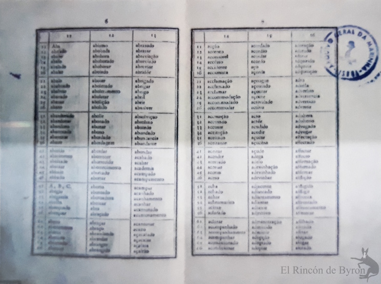 Cabe señalar que las tablas eran manuscritas y que sólo esta edición de 1810 llegó a imprimirse, a cargo de la Imprenta Real. La estructura de las tablas impresas (90 páginas, 108 entradas – letras, palabras o frases – en la mayoría de las páginas, es decir 9720 entradas, en números redondos) y la expresión de los términos (mediante la conjunción de las cifras correspondientes en cada una de las 36 líneas y de las tres, o cuatro, columnas por página). [2]