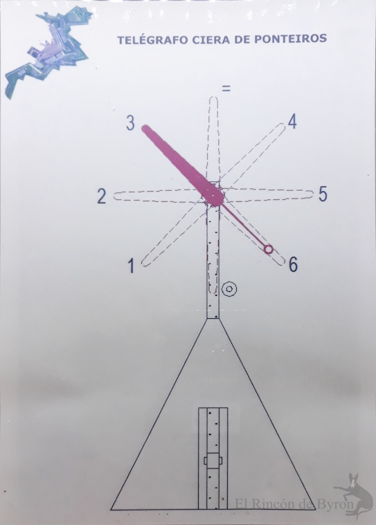«The Portuguese system (which was proposed after considering the many others presented) has a single crank, with which its single pointer is tilted at 45º intervals with respect to the vertical mast; so that a single man observes, makes the signals and writes, all at the same time; because he has his eyes fixed on a telescope attached to the mast, he moves the crank with his left hand, leaving his right hand free to write on a slate conveniently attached to the mast for that purpose.«