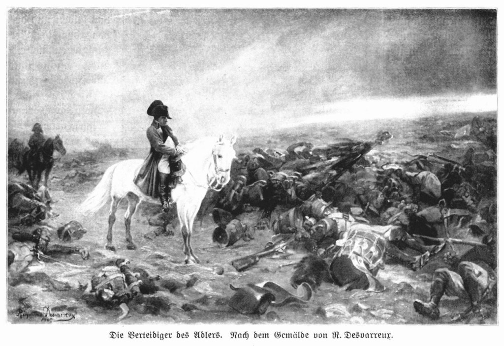 “Los defensores del Águila”, recordando un episodio trágico de la campaña de Sajonia, en 1813. Napoleón, viajando al anochecer en un campo de batalla, de repente se encontró con un montón de muertos del que emergió, entre manos apretadas, un estandarte. Y se dice que se apoderó de este prodigioso espectáculo de una emoción de la que no estaba acostumbrado, lloró. El emperador, justo en su caballo, iluminado fantásticamente, observa la sombra. No hay duda, en los medios de realización, un poco de melodrama. Sin embargo el conjunto es de una expresión llamativa y grandiosa.6