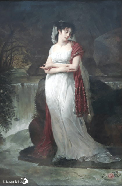 ※ La modelo, Christine Bonaparte (1771-1800), la primera mujer de Luciano Bonaparte (hermano del emperador Napoleón I), murió de pleuresía a la edad de 28 años. En este retrato de pie de gran tamaño realizado después de su muerte, Gros abandona la formalidad en favor de un sentido de melancolía a la fragilidad de la vida, simbolizada por la rosa que es llevada por la corriente del arroyo.