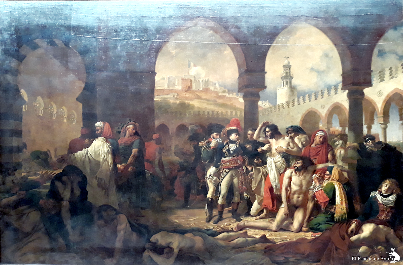 La imagen muestra al general Bonaparte visitando a las tropas francesas golpeadas por la plaga en el patio de una mezquita de Jaffa que se está utilizando como un hospital militar. La escena tuvo lugar en marzo de 1799 durante la campaña de Siria. Bonaparte, en un rayo de luz del día, ignorando al médico que intenta disuadirlo, toca la pústula de una de las víctimas de la plaga con la mano desnuda. Uno de los oficiales mirando la escena con un pañuelo sobre su boca. A la izquierda, dos árabes están repartiendo pan a los enfermos. A la derecha, un soldado ciego está tratando de acercarse al general en jefe. En el primer plano, en las sombras, los moribundos son demasiado débiles para volverse hacia su líder. El pintor da a entender que la virtud y el coraje de Bonaparte justifican los horrores de la guerra. Gros le ha dado el aura luminosa y los gestos de Cristo sanando a los leprosos como en las pinturas religiosas.