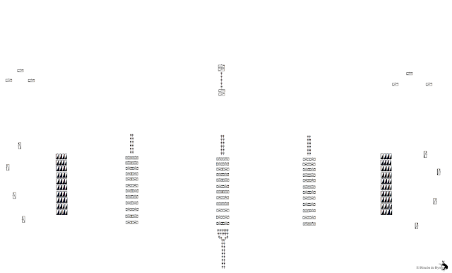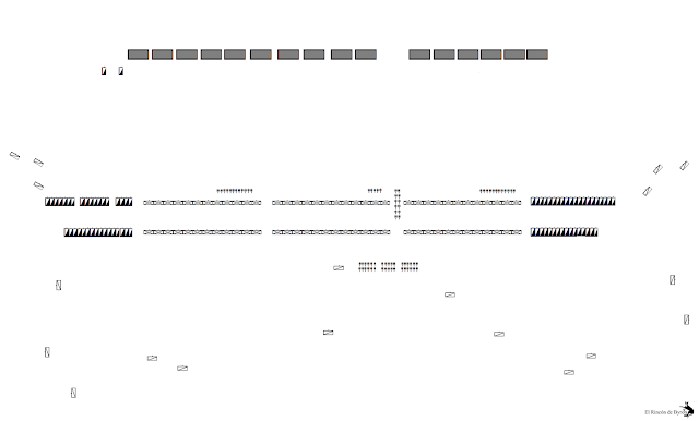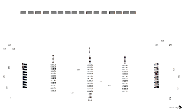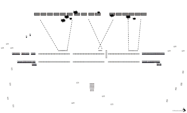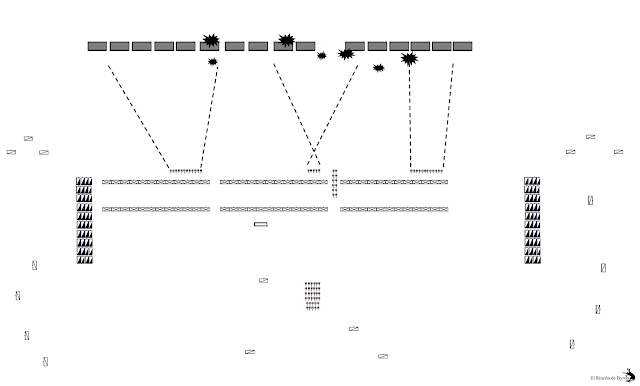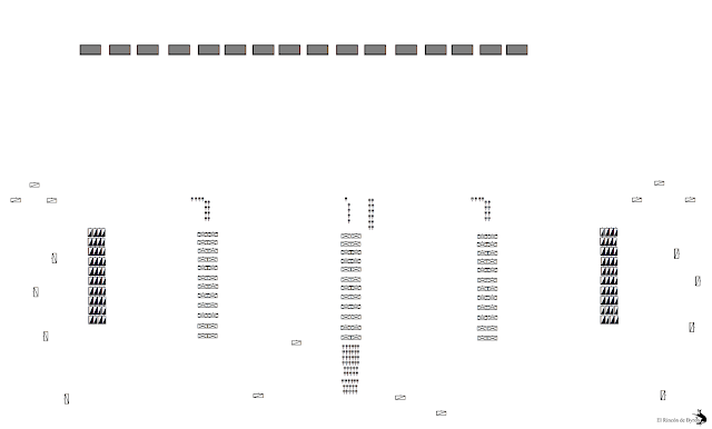 En la filmación, que no deja de ser una traslación animada de algunas de las enseñanzas que definen el ensayo de Guibert y más concretamente las evoluciones de un ejército de la época en formación de marcha y cómo se va transformando o mejor dicho, maniobrando, frente a la presencia del ejército enemigo. Con paciencia franciscana hicimos fotos de cada secuencia y hemos elaborado los esquemas que veréis a continuación, que no dejan de ser una copia de cada una de las secuencias, pero que quedaban algo deficientes en la fotografía para reproducirlas.