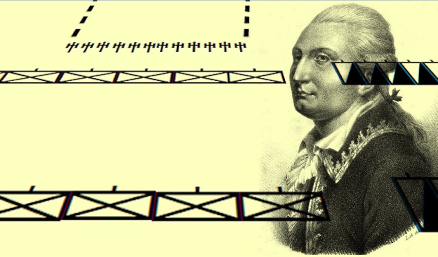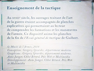 «En el siglo XVIII, las obras tratando del arte de la guerra iban acompañadas de planchas explicativas que permitían a su lector comprender las formaciones y las maniobras del ejército. Este dispositivo anima las planchas del final del Ensayo general de táctica de Guibert»