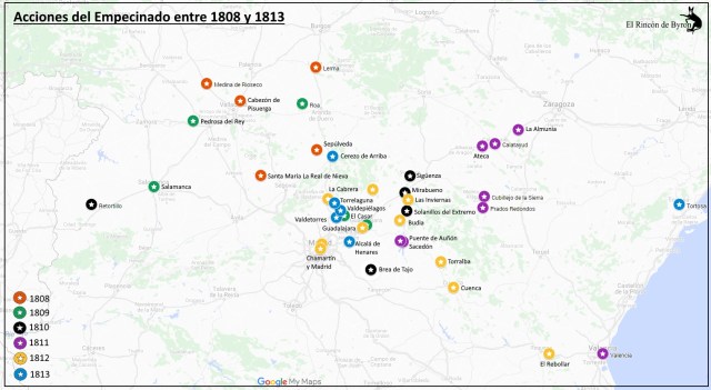 | Acciones del Empecinado entre 1808 y 1813, donde se aprecian las áreas de actuación. |
