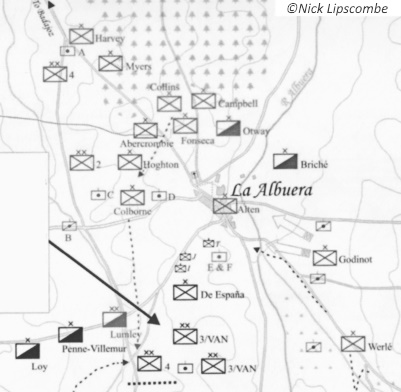 Ahora son aproximadamente las 8 en punto. La caballería de Latour-Marbourg comienza a subir aquí, la caballería ligera de Briché y los dragones de Bron de Bailly, los más pesados al sur de aquí y comienzan a realizar un reconocimiento, para averiguar donde estaban exactamente los cañones y los de Dixon están emplazado allí, con dos baterías portuguesas en la colina, algunas en la loma escarpada. En este punto, tenemos la primera llegada de los lanceros polacos, recuerden que son entre las siete y las ocho de la mañana y los soldados aún con los hábitos de las mañanas inglesas están desprevenidos, por lo que vienen aquí y sorprenden a los artilleros que se tienen que refugiar bajo sus cañones, y los lanceros intentan atacarlos con las lanzas. Tienen pistolas, pero los artilleros también tenían fusiles Brown Bess que dispararon y los españoles también disparaban contra los lanceros polacos. Fue un shock. No hay duda para Beresford, el ataque principal está aquí, y el despliegue de Wellington fue correcto, y está absolutamente obcecado por esta idea.