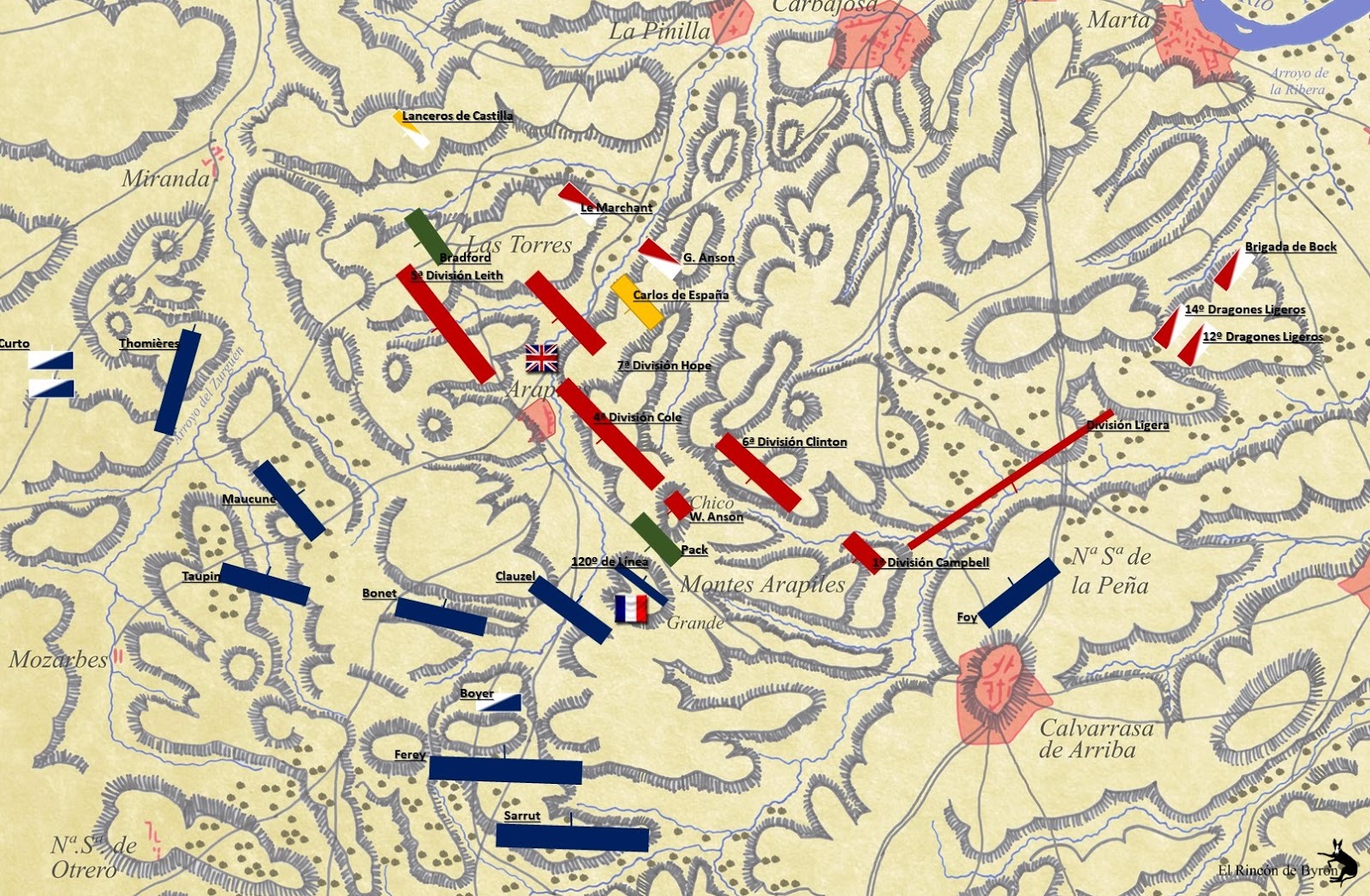 Hoy veremos esta etapa de la batalla con la transición de las tropas anglo-aliadas desde una formación de marcha hasta el primer despliegue frente a las tropas francesas con sus mejores efectivos y la caballería en reserva y flancos y las tropas aliadas también en los flancos con ese famoso punto de apoyo o anclaje destacado en el Arapil Chico. Lo que marcó el destino de la batalla o dicho de otra manera, el principio del fin para las tropas francesas, fue el rasgo de oportunismo de Wellington al darse cuenta de un error táctico definitivo en el despliegue de los franceses, y que provocó que, involuntariamente, una pata de pollo medio comida pasara a la Historia. ¿Cual fue ese error definitivo? Como siempre Nick Lipscombe nos sacará de dudas y nos seguirá describiendo esta gran batalla, que algunos han querido ver como otro ejemplo del orden oblicuo de Federico el Grande y que le dio a su artífice reconocimiento a nivel de toda Europa, la llave de la entrada en la capital de España y poner en entredicho a los que lo conceptuaban como un general defensivo.