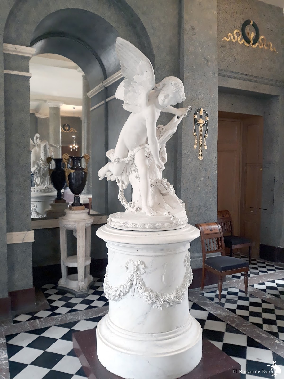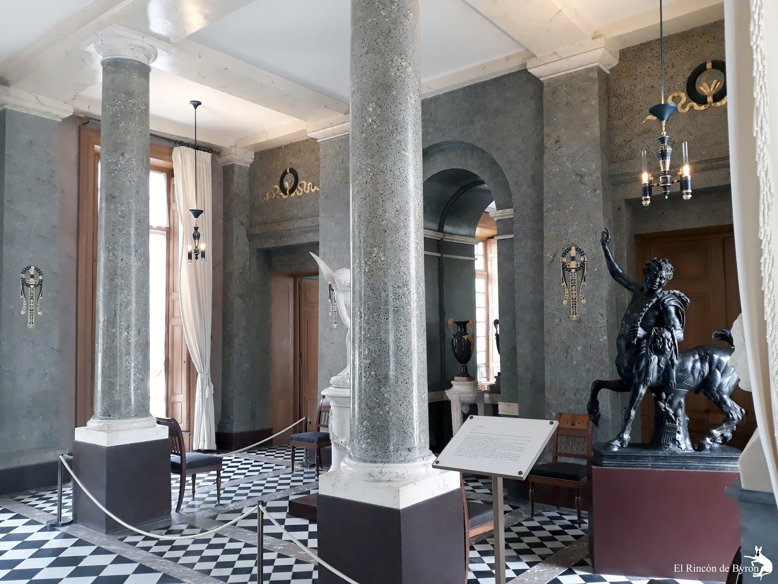 El arreglo del vestíbulo fue el primer trabajo realizado por Percier y Fontaine. La restauración de 1991-1992 hizo aparecer delicados falsos granitos, falso mármol y falso pórfido de origen, pero no pudieron restaurar el ingenioso sistema de ventanas corredizas colocadas en los arcos centrales, que permitieron abrir la pieza sobre la sala de billar y el comedor. Al igual que en las otras salas del castillo, el inventario realizado en 1814 después de la muerte de Josefina, permitió evocar los muebles originales, vendidos en 1829. Además de las doce sillas estampadas de Jacob Frères y entregadas a la biblioteca de Murat en el Elíseo, figuran cuatro bustos de miembros de la familia imperial que reemplazaron a los existentes de los emperadores romanos.