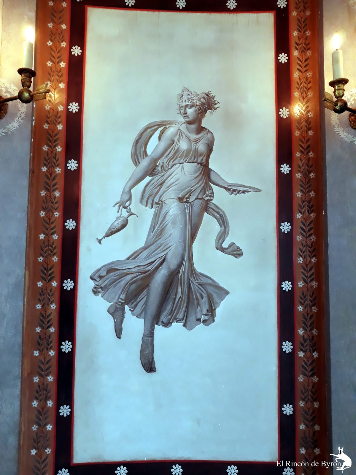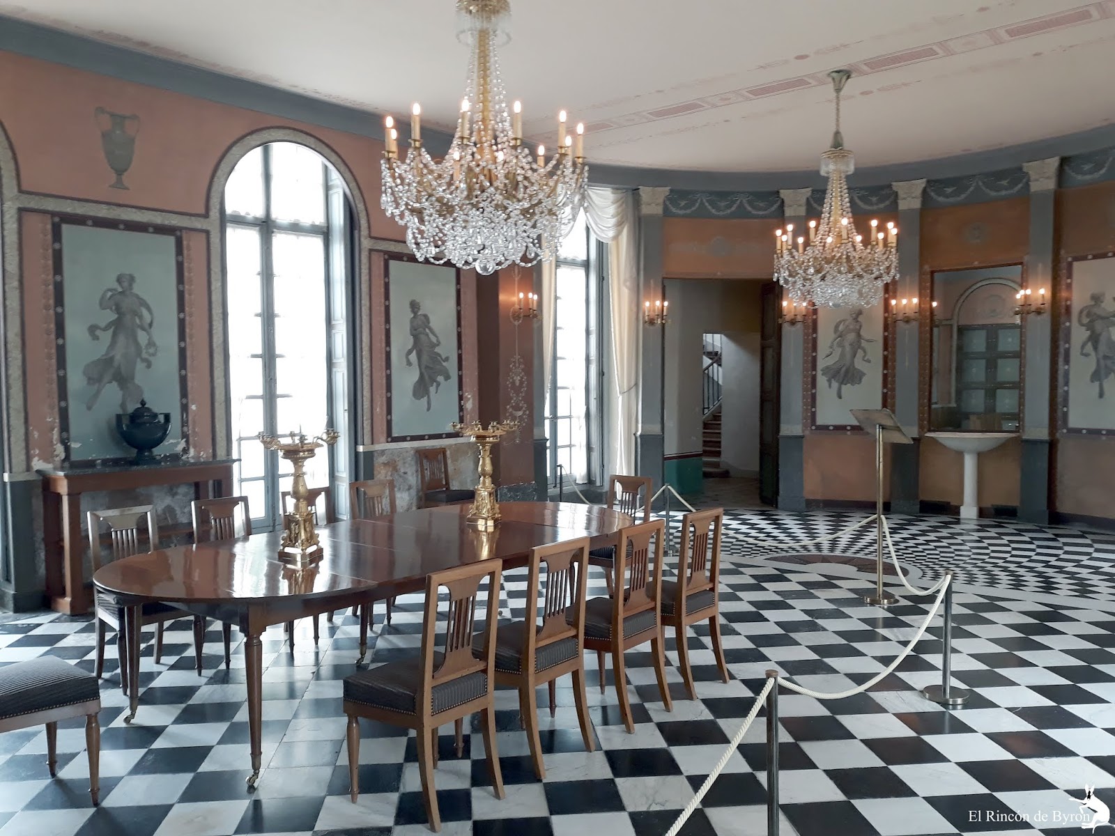 Del 1703, todo da un giro excepcional para la época, se menciona un comedor esclarecido por cuatro ventanas en esta ubicación. Percier y Fontaine lo ampliarán agregando la parte semicircular, en el suelo cubierto con un pavimento suntuoso de mármol blanco y negro. Encargarán al pintor Louis Lafitre una serie de seis bailarinas pompeyanas pintadas en estuco, que forman la parte principal de la decoración. Restaurado en 1985 y 1987, el comedor ha encontrado su decoración original enriquecida en 1812 por Berthault, con las arcadas de madera adornada con grupos de frutas destacándose sobre un fondo de uvas. El original mobiliario de caoba, muy sencillo, se vendió con todos los muebles en 1829 y fue reemplazado por doce sillas y una mesa del Palacio de las Tullerías, que complementa las tres consolas entregadas por Fontainebleau.