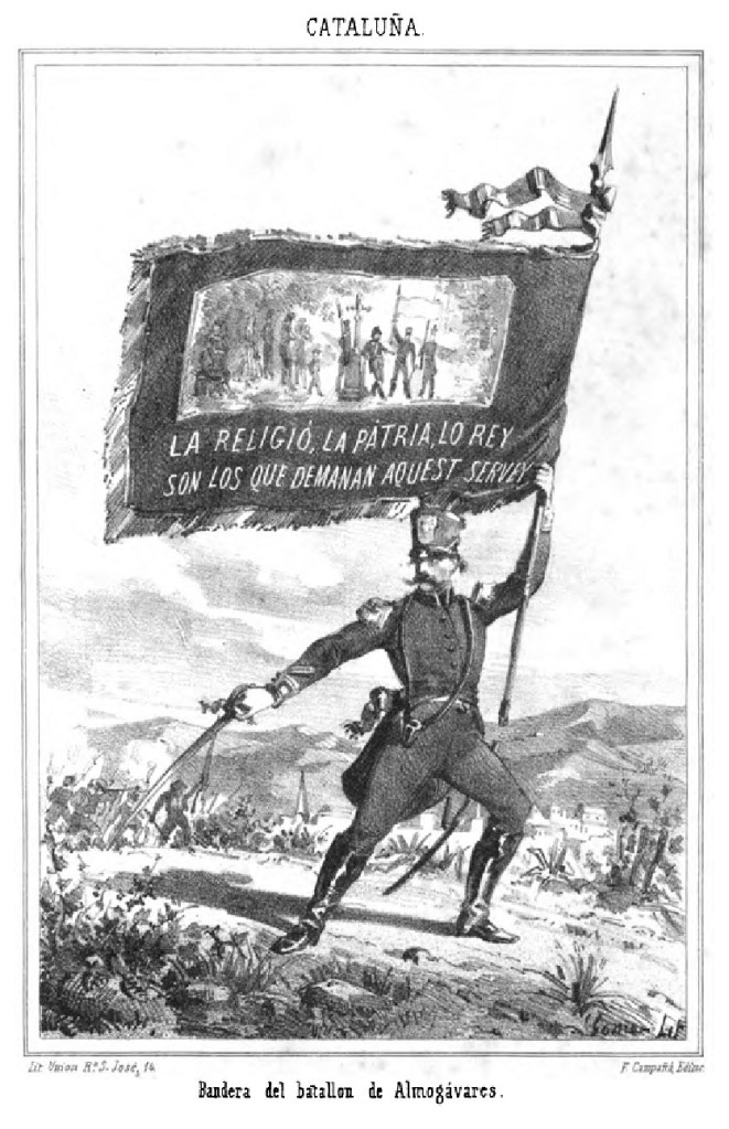 - 4º. La bandera será negra, en una cara se demostrará un país ameno y en su medio una cruz, apoyado en ella Fernando VII, a su alrededor tres soldados armados como queda dicho, un grupo de gente en inspección, y un lema, la Religión, el Rey y la Patria son los que lo demandan (demanan aquest servey) y en la otra las armas de Figueras.