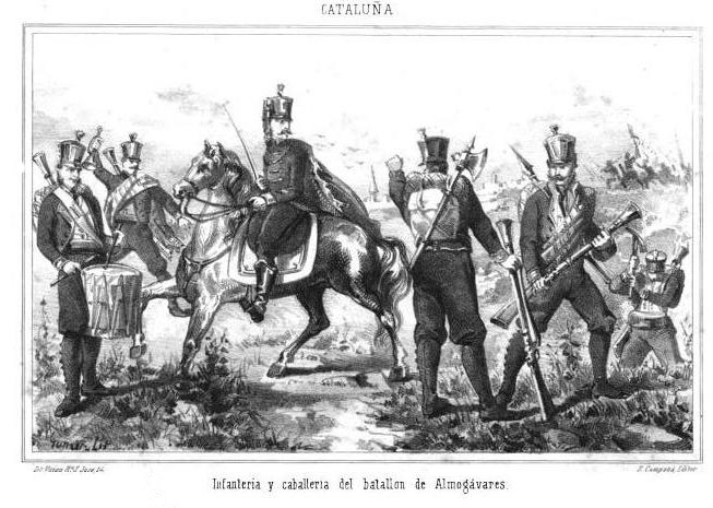 – Diciembre 1809.- El día 31, en la ciudad de Manresa (Barcelona), Narciso Gay redacta el proyecto3 de creación del 1er Batallón de Almogávares, en el corregimiento de Figueras. Entre los motivos que destacaba, «[…] movido del verdadero patriotismo, que le anima y tiene acreditado en defensa de la Religión, Rey y Pàtria, y bien persuadido que el antiguo nombre de Almogàvares y un uniforme atractivo puede hacer brillar el entusiasmo de los catalanes en la actual guerra en igual forma que en la que nos hicieron los sarracenos, presenta el plan que ha formado para levantar un cuerpo de tropa…[…]» y cuyo primer objetivo era mantener «la pública tranquilidad»4. [13]