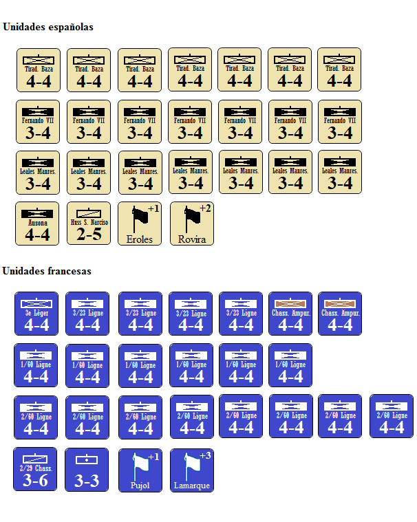 Al igual que en las antiguas series de los libros de Osprey Publishing, para clarificar el campo de batalla y sus alrededores, como complemento al artículo de hoy nos hemos dedicado estos días a grafiar un tablero de juego hexagonal de la batalla de Mianegas o de Bañolas (a partir de un mapa topográfico del año 34), que se puede jugar con el reglamento de «Napoleon at Waterloo», de Jim Dunnigan, pero que podéis adaptar a cualquier otro que escojáis con el orden de batalla que hemos descrito anteriormente para los dos contingentes. La escala del tablero es de 200 m cada hexágono de lado a lado y la escala de tiempo es de 30′ por turno aunque obviamente también se puede variar. Las unidades de infantería son compañías, las de caballería, escuadrones y las de artillería, baterías (sólo en el caso francés). En principio no hemos pensado en apilar (stacking) las piezas, pero si optáis por hacerlo, pensamos que no más de 2 unidades por hexágono sin contar el líder o la artillería, por ejemplo.