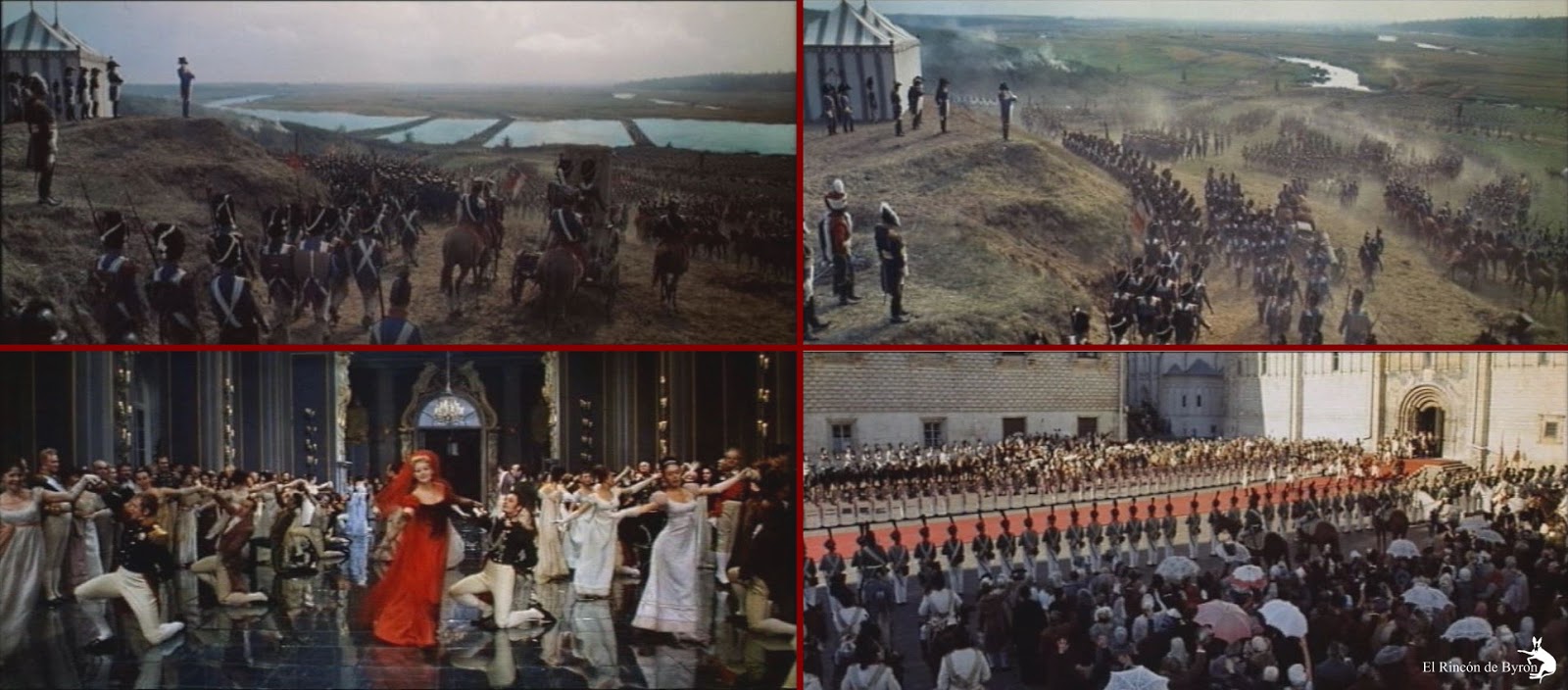 El incendio de Moscú, a lo largo de unos nada despreciables 403 minutos de metraje en la versión que contemplamos. No sólo el metraje alcanza una dimensión considerable en esta película. El film se realizó con la plena cooperación del gobierno soviético de entonces, el Ejército Rojo y los ciudadanos de Moscú. La batalla de Borodinó necesitó dos años de filmación y un año de postproducción, con más de 300 actores y 12.000 mil extras involucrados. Se filmaron alrededor de 200 cañones en acción en la batalla y alrededor de unos 10.000 mil rifles fueron utilizados por los extras y especialistas. En 1965, durante el rodaje de la misma, el director
