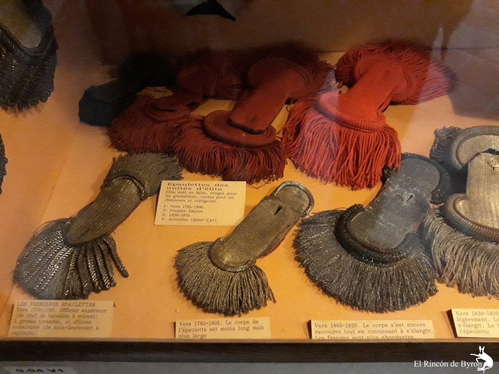 Constituidas del cuerpo (Corps), ribete circular (Tournante) y de los canelones (Franges). También están sometidas a la evolución de la moda. La charretera fue instituida en 1759 por Choiseul, ministro de Luis XV, para distinguir los empleos. Se confeccionan de metal tejido, dorado o plateado. En 1779, se crearon charreteras de lana de colores para distinguir las compañías de élite, granaderos o cazadores y luego voltigeurs. Con la supresión de las compañías de élite bajo el Segundo Imperio, todas las unidades recibieron las charreteras rojas, por entonces reservadas a los granaderos.