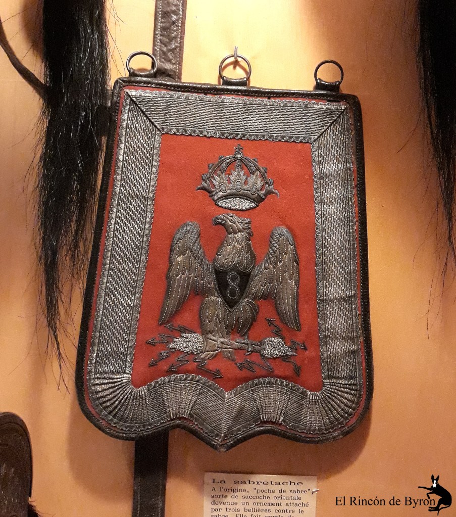 En su origen “poche de sabre” (bolsillo de sable), una especie de bolsa oriental que se convierte en un adorno unido por tres hebillas contra el sable. Forma parte del uniforme a la húsar (à la hussarde). Aquí, un portapliegos de oficial de un regimiento de húsares, Primer Imperio, bordado en oro y plata.