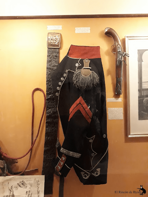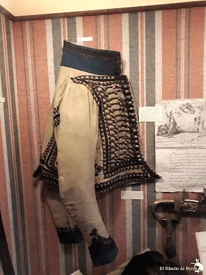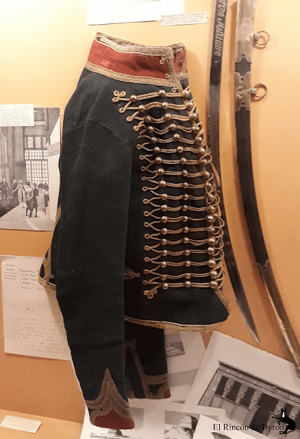 A la izquierda, dolmán del Primer Imperio (trompeta). El cuello es alto, las trenzas o «brandenburgos», del mismo ancho de arriba a abajo hasta el comienzo del Imperio, comienzan a expandirse en los hombros.