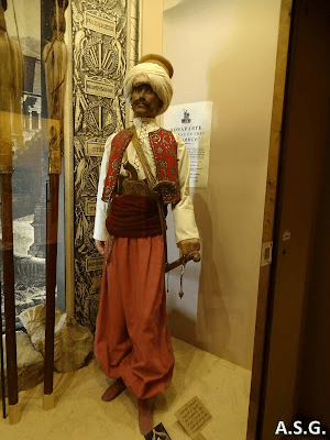 El mameluco representado aquí lleva las armas orientales. Las pistolas están dentro de un “koubow”. El “kahouk” (sombrero) es el único conocido. El “béniche” (camisa) es reproducción.