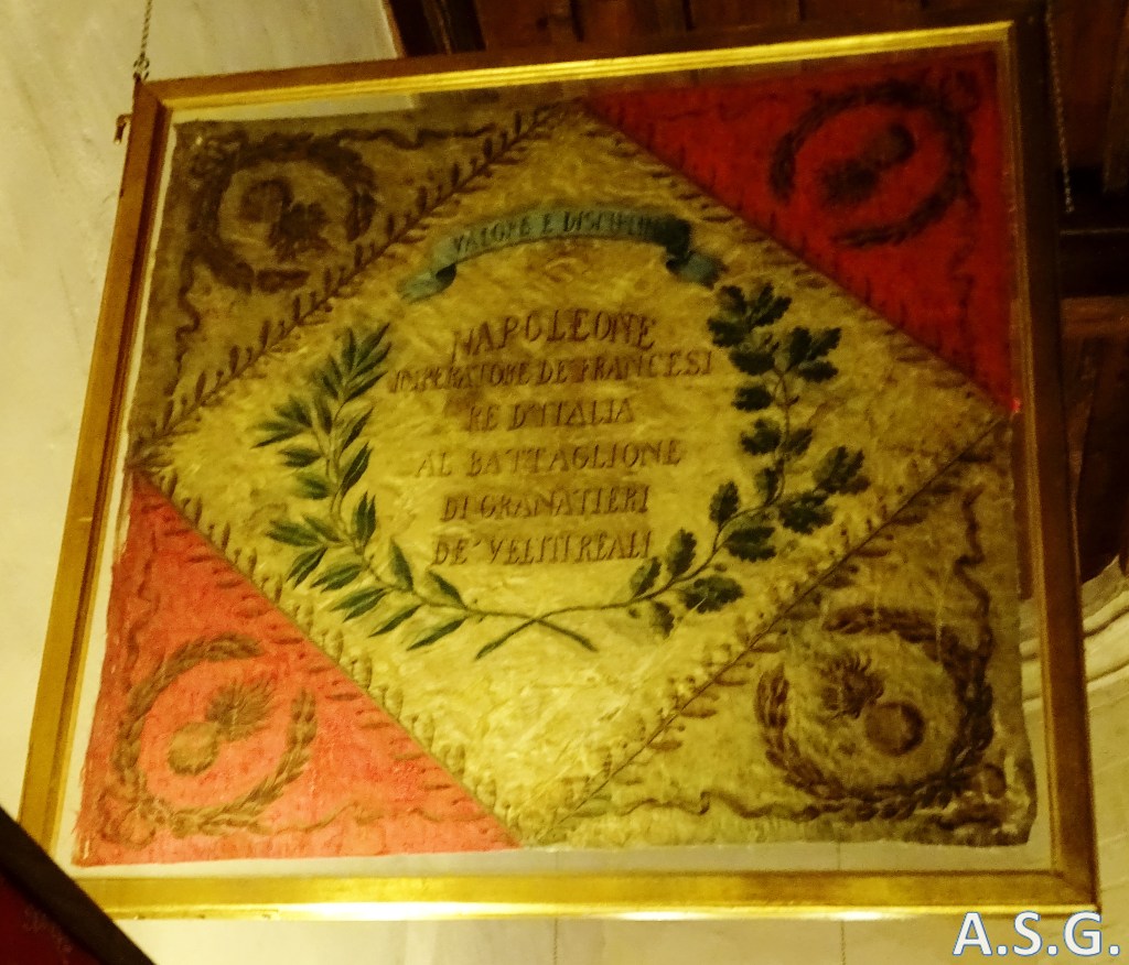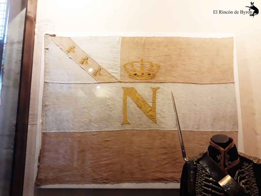 La “N” coronada y las abejas están hechas de seda pintada. Como se le había prohibido la tricolor de Francia, Napoleón escogió los colores de la Toscana, blanco y rojo, para su emblema de la isla de Elba.