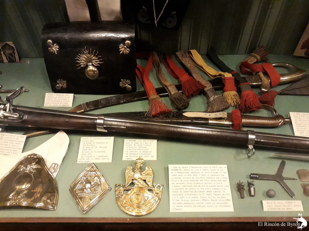 El arma del soldado de Infantería era el fusil con su bayoneta, modelo del año IX (1801), este es de la Manufactura Imperial de Saint-Etienne y su cañón lleva la fecha 1811. El arma se cargaba por la boca. El disparo era producido por la chispa de un pedernal que golpeaba una pieza de metal llamada batería (rastrillo). Esta chispa encendía el cebo que consistía en un poco de pólvora vertida en la cazoleta de cobre. El fuego era transmitido a la carga del cañón por un conducto llamado oído (“lumière”). La carga se efectuaba en 12 tiempos. La cadencia de tiro era de 2 a 3 tiros por minuto. Peso: 4,5 Kg. Calibre: 17,5 mm. Velocidad inicial: 340 m/s. Alcance útil: 200 m. Las armas francesas estaban entre las mejores y fueron copiadas por casi todas las potencias de Europa.
