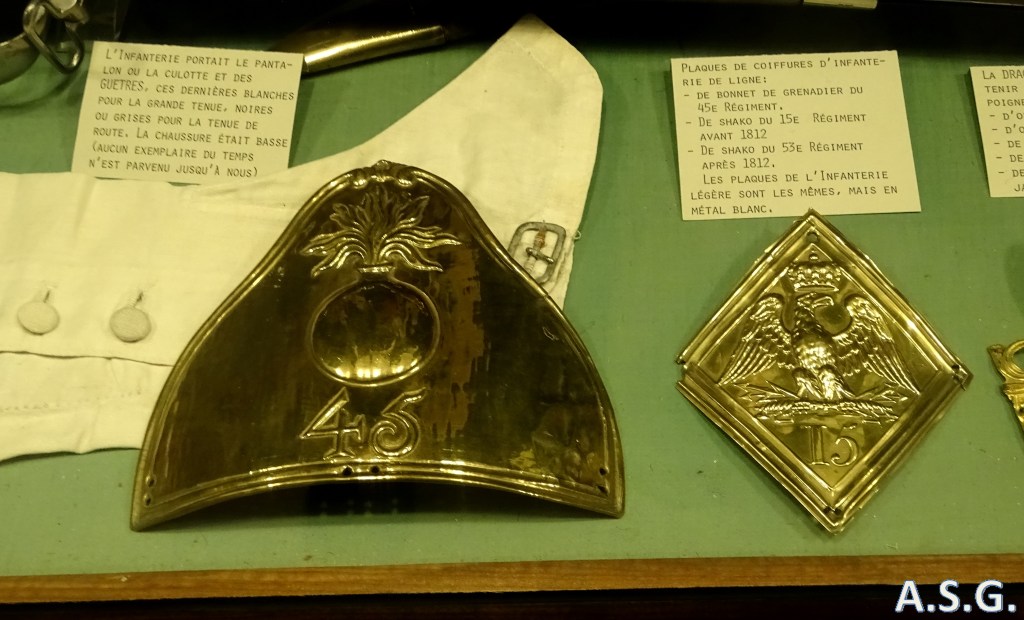 Placas de sombrero de infantería de línea: DE izquierda a derecha, de gorro de granadero del 45º regimiento; de chacó del 15º regimiento antes de 1812; de chacó del 55º regimiento después de 1812. Las placas de infantería ligera son las mismas, pero en metal blanco.