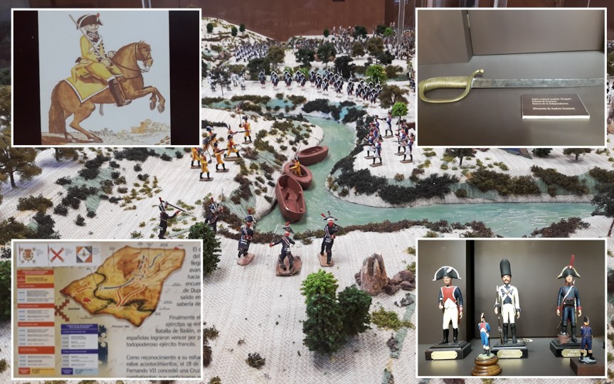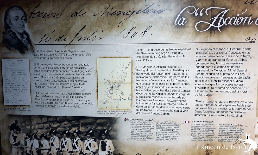 En nuestra estancia en Mengíbar este octubre pasado pudimos visitar la Sala «Acción de Mengíbar 1808», que se halla en el Edificio de Usos Múltiples de la localidad, y que recoge entre otros una maqueta del combate previo a la batalla de Bailén, el 16 de julio de 1808, entre las tropas del general Reding y las francesas del general Gobert.