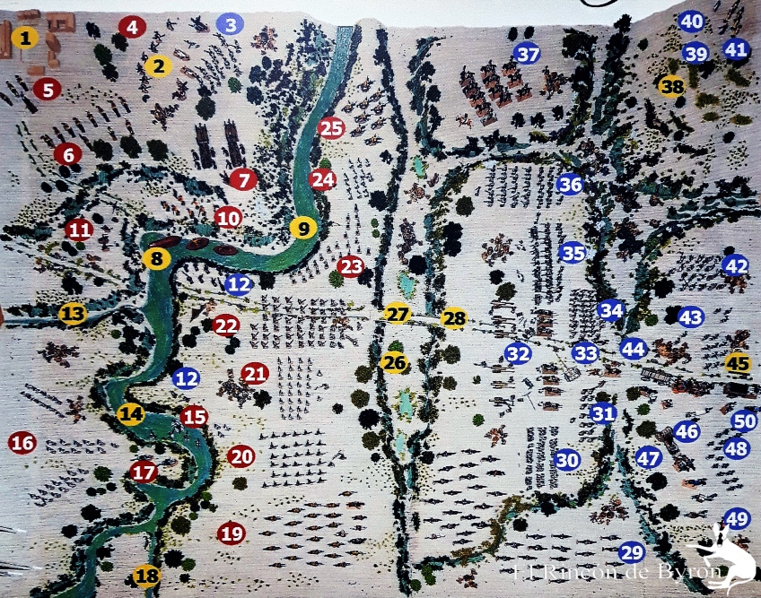 3. Regimiento de infantería n.º 8 (voltig.); 12. Infantería de línea, granaderos; 29. 2º Regimiento de coraceros; 30/39. Regimiento de infantería n.º 8; 31. Regimiento Suizo; 32. Artillería de línea; 33. Generales Ligier-Belair y Dufour; 34. Regimiento Suizo; 35. 5ª Legión de Reserva; 36. Regimiento de infantería n.º 8 (3ª Comp.); 37. Regimiento de Dragones, n.º 2. 40. Edecán; 41. Ingenieros-zapadores; 42. Banda Música de la 5ª Legión de Reserva; 43/48. Regto. de infantería n.º 8 (2ª Comp.); 44/47. Tren de artillería; 46. Ambulancia de Sanidad; 49. Correo portador de órdenes; 50. Edecán;