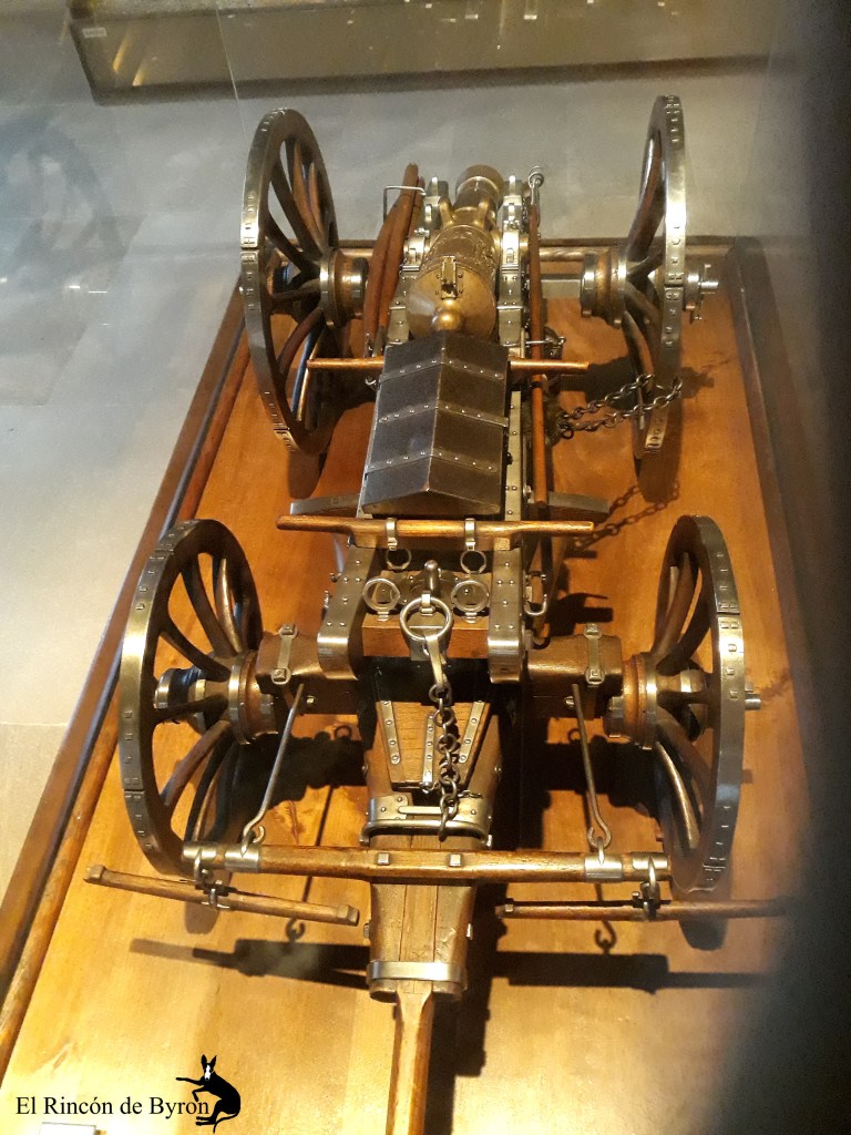 Pieza de campaña de 8 libras (peso de la bala), sistema Gribeauval, Modelo a la escala de ¼, obra de F. Brezin, maestro de forja (1758-1828), datado en 1791, con su cajón expuesto en la segunda vitrina.