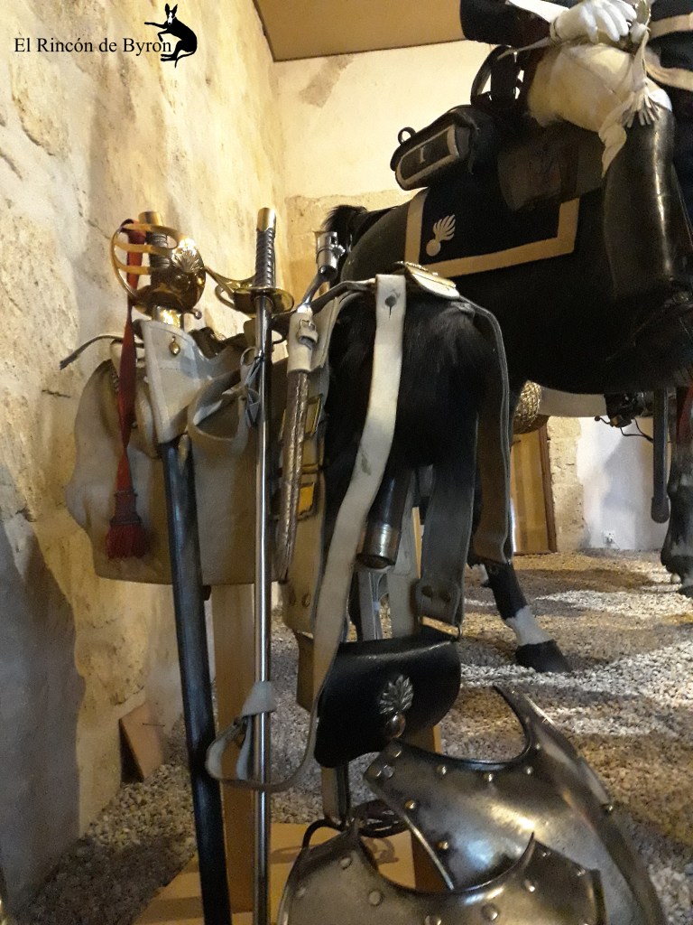 Casco y corazas de la última etapa del Imperio. Sable modelo An XIII (1805). Pantalón de piel. Silla a la húngara de caballería pesada. (silla reconstituida). Este regimiento tomó parte en todas las campañas del Imperio de Austerlitz a Waterloo.