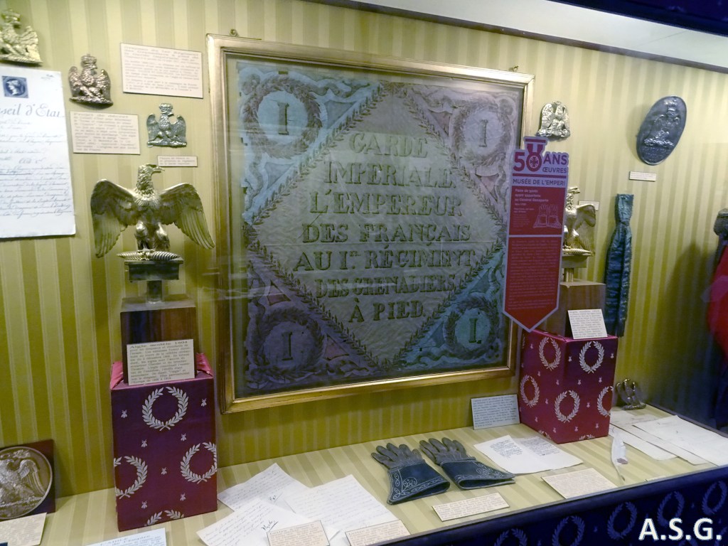 Del modelo 1804-1811, esta bandera es de tafetán de seda tricolor de un único espesor, adornos e inscripciones pintadas en oro con revestimiento al aceite. En el reverso: VALOR Y DISCIPLINA. 1er BATALLÓN. Su asta está coronada por la águila en bronce dorado hoy desaparecida.