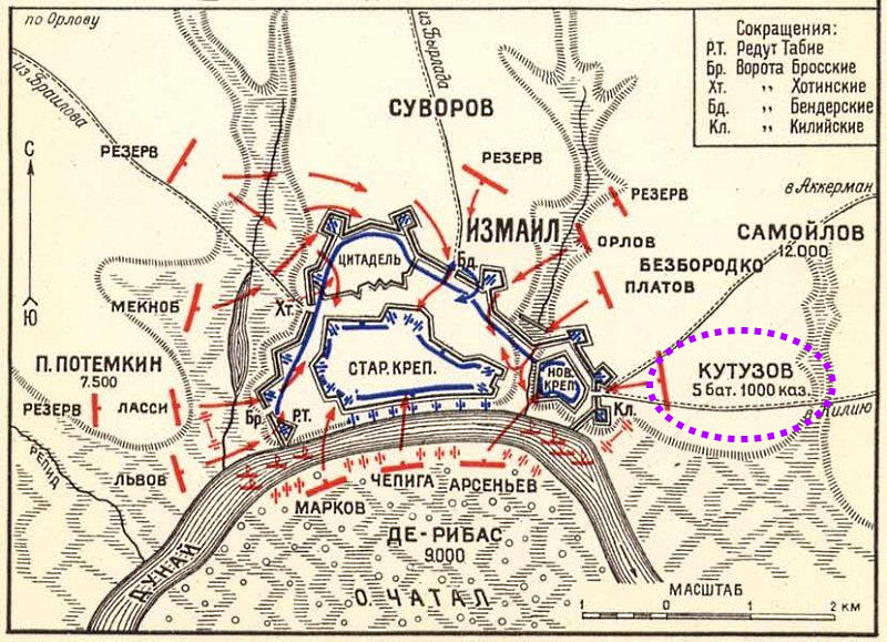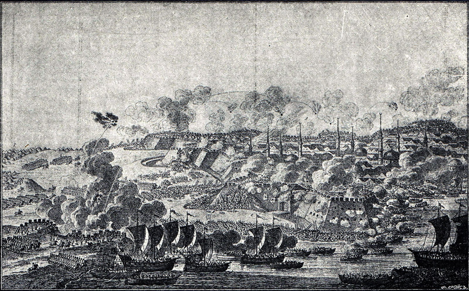 (4) – Surgieron fuertes disputas entre Suvorov, que era partidario de una rápida resolución del asedio con un asalto sobre la ciudad y Potemkin, superior de Suvorov y favorito de la Reina que quería prolongar el asedio para ahorrar vidas. Finalmente prevaleció la opción de Suvorov.
