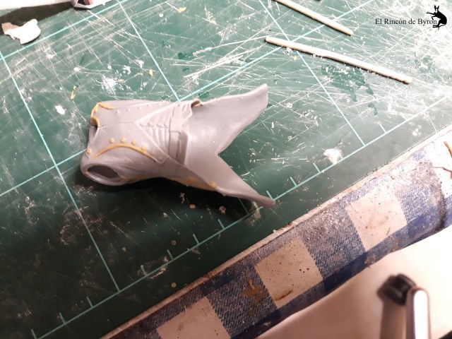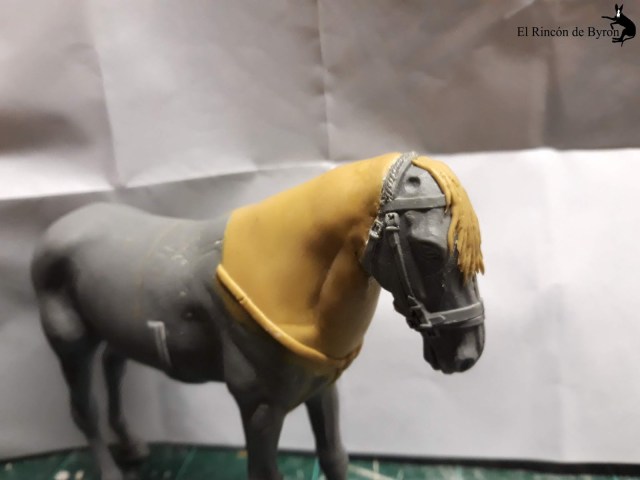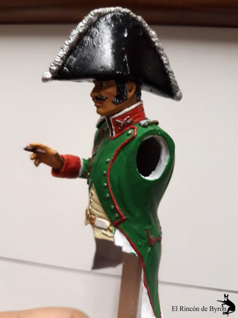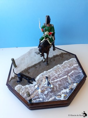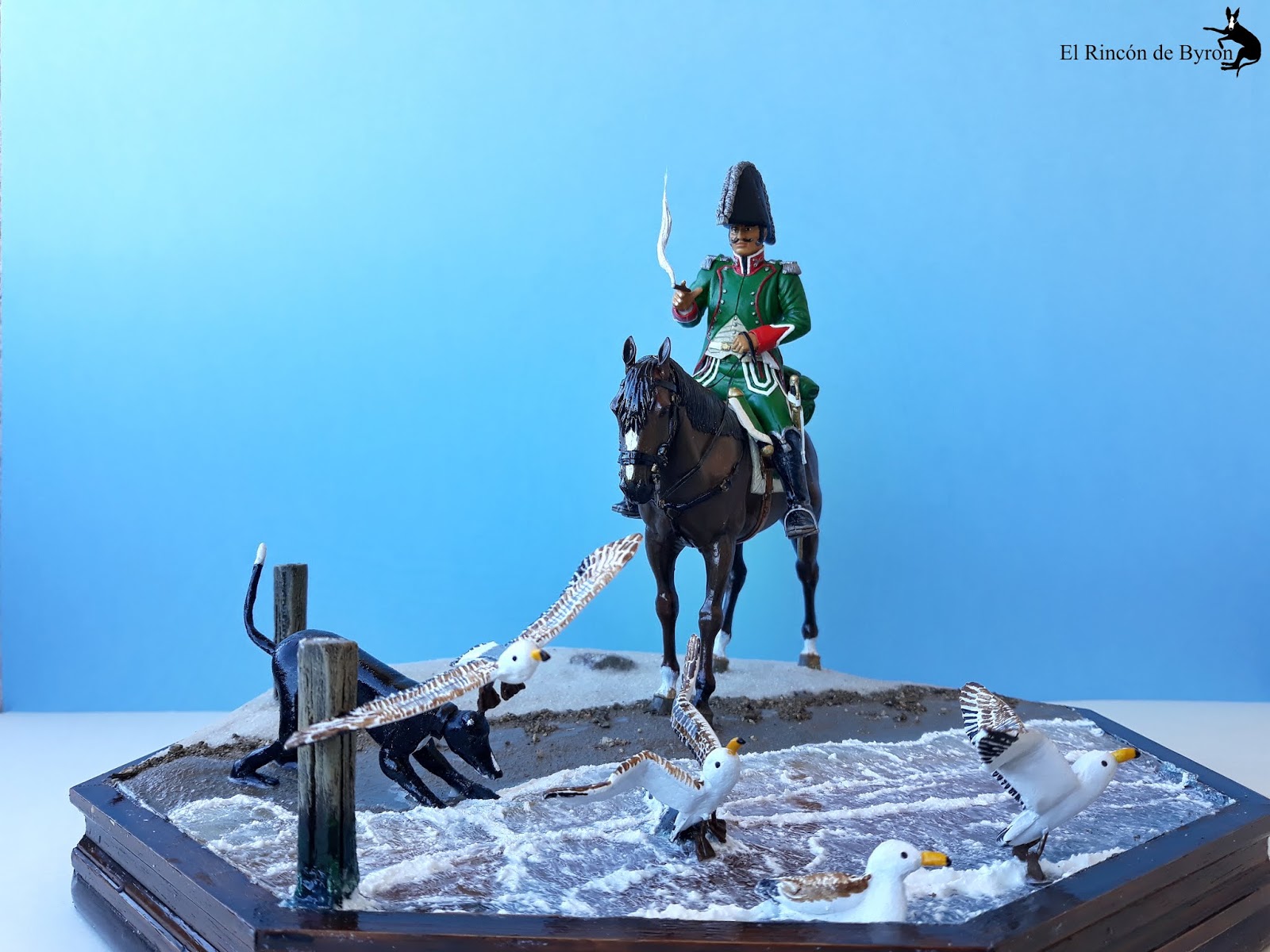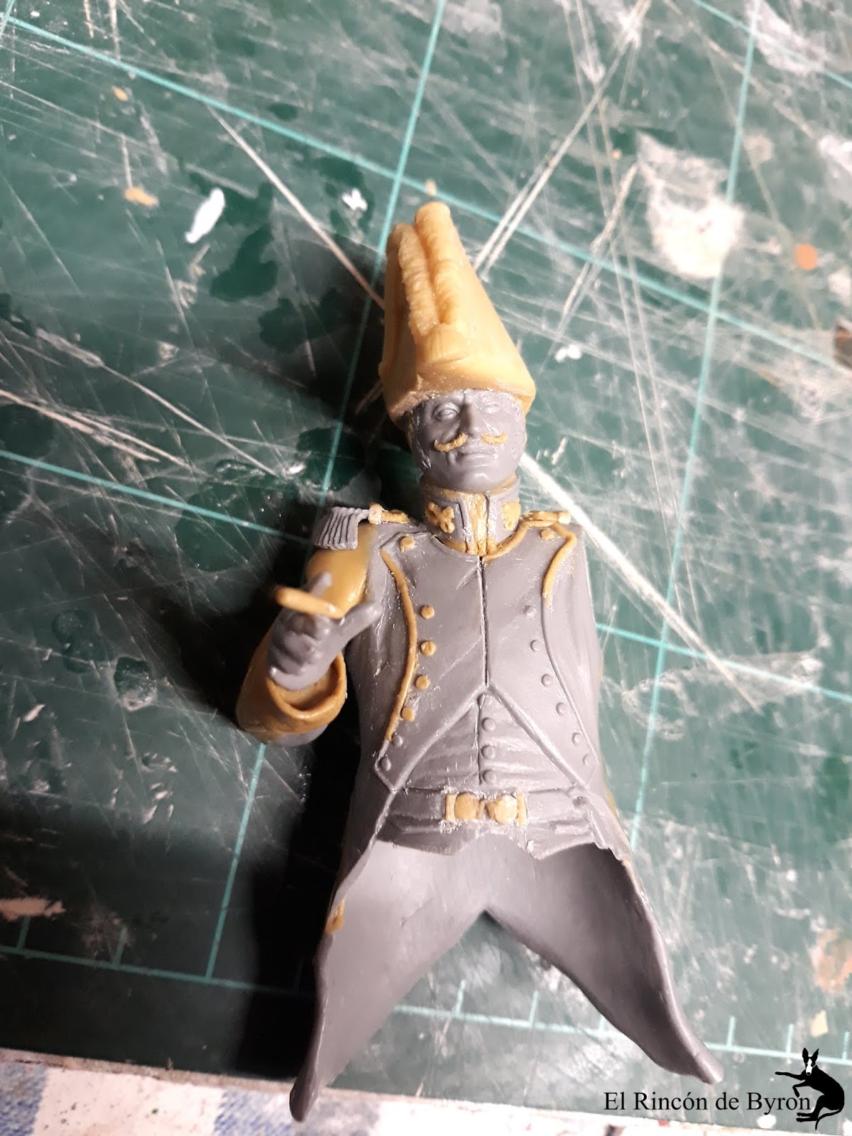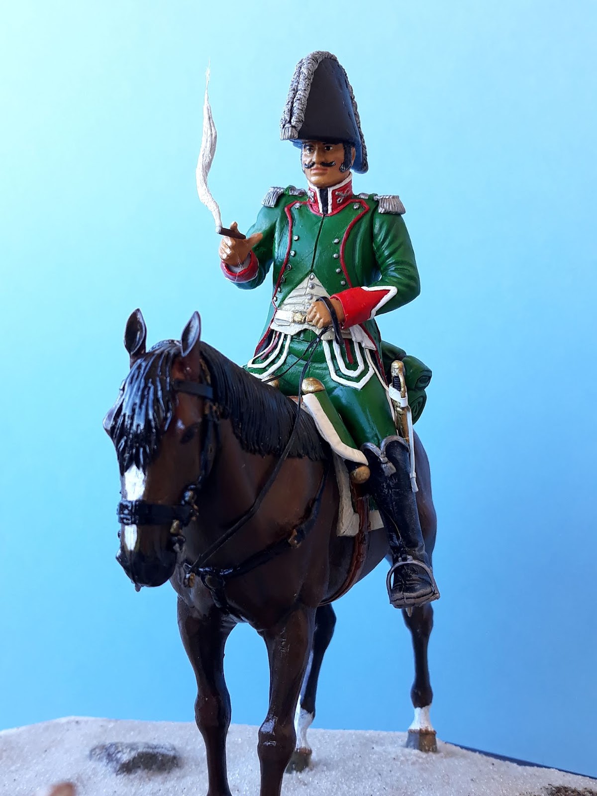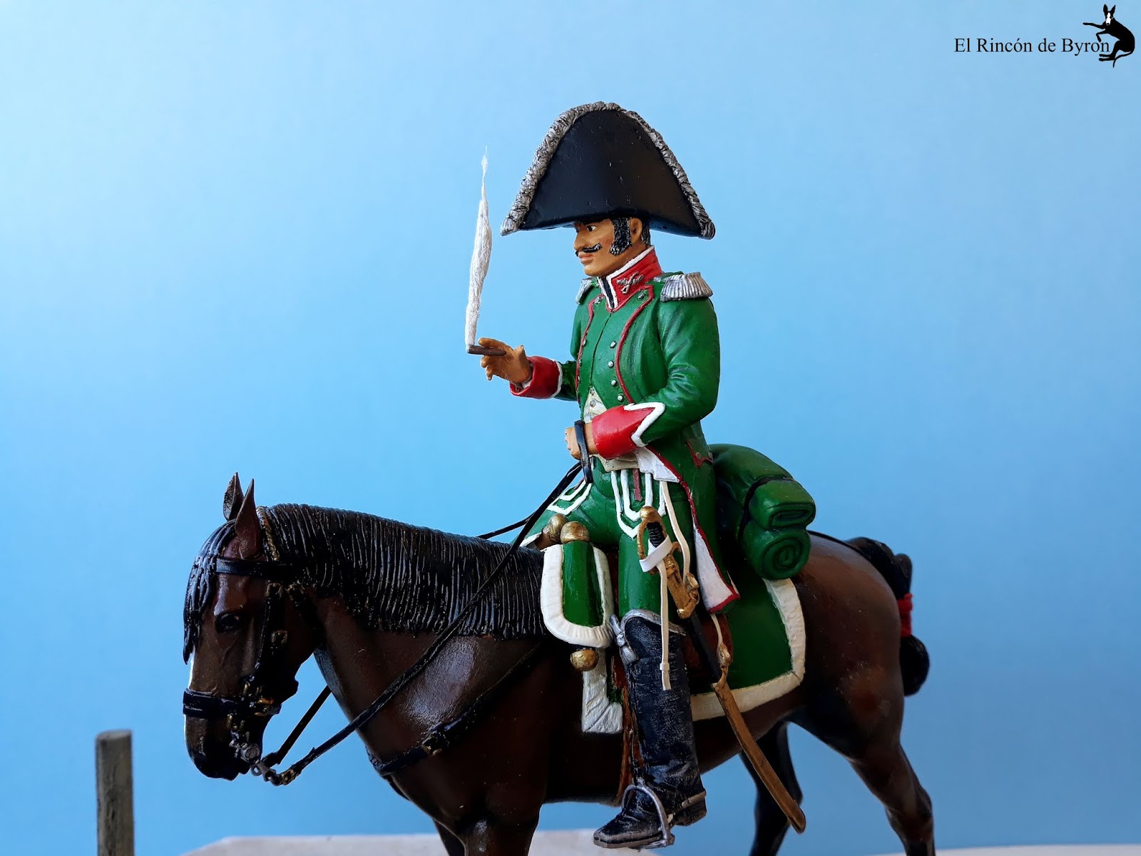 El siguiente elemento es el jinete, inspirado en las imágenes superiores y que hemos modificado casi por entero a partir de una figura de Dragón montado francés de la casa MiniArt, de 120 mm. Al ser una figura de oficial tiene un bicornio, que hemos sacado de otra figura de mariscal de la casa Verlinden, de la que ha habido que suprimir todo el ribete decorativo que bordeaba las plumas de acabado y retocar el agujero para la cabeza, ya que originalmente estaba pensado para un bicornio perpendicular a la cabeza. Asimismo añadirle con una masilla Tamiya de dos componentes tanto el bigote como las insignias de cazadores del cuello, un sable curvo y una palma según R.O. de 10 de abril de 1805 (a pesar de tener la denominación de \»dragones\», conservaron para esta campaña el uniforme de cazadores a caballo).
