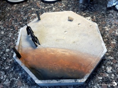 Uno de los puntos delicados es el del agua. El agua la podemos hacer con masilla y luego pintada con acrílicos y barnices, o con resinas, que siempre queda más curioso, aunque para esta escena cualquiera de los dos métodos hubiera resultado. El hacerlo con este producto en concreto era por las ganas de probar su manejo y acabado. El resultado vale la pena pero conviene hacer unas puntualizaciones: Las bolitas plásticas, el material en cuestión, hay que volcarlas en el interior de un cazo, según la cantidad que necesitemos y ponerlo a calentar hasta que obtengamos una consistencia líquida, momento en el que ya lo podemos volcar en nuestra playa. El primer punto es que hay que tener cuidado con las burbujas que genera una vez depositado, yo la derramé quizás muy pronto, y estuvieron saliendo burbujas un buen rato. Las burbujas con un mechero de cocina de llama las podeis ir eliminando, ya que con esta desaparecen, pero no se si habiendo dejarlo reposar más tiempo no hubieran salido tantas… El otro punto y este ya más desagradable es que una vez seco se cuarteó por dentro, no se si por efecto del excesivo calor, o porque recibió algún golpe, pero ya complicaba la escena.
