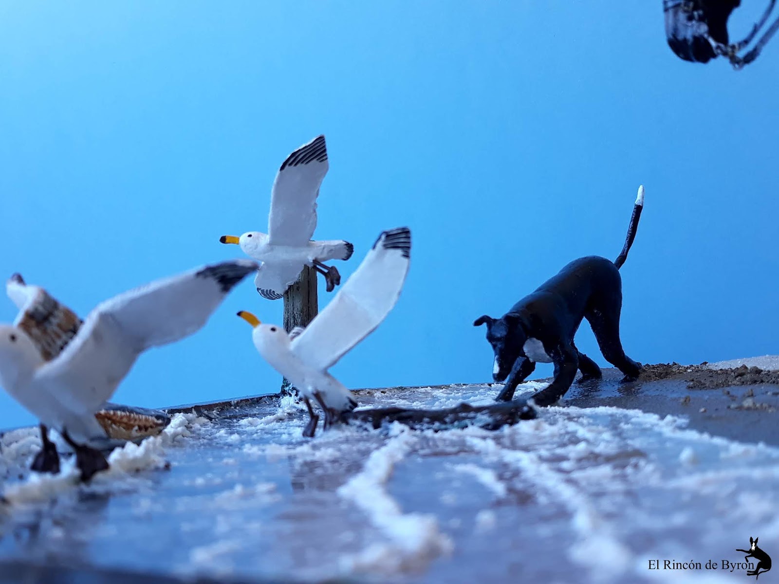 La orilla de la playa más próxima al agua en la foto está pintada con un tono marrón más fuerte (la arena húmeda) muy diluido. La tercera -y la vencida-, fue fijarse bien en como actúan las olas cuando llegan a romper a la orilla y sobretodo cuando se retiran en las fotos. Finalmente con Vallejo Diorama Effects Water – Acrylic Transparente hicimos las crestas de las olas que llegan más menguadas a la orilla, y el efecto de la ola picada con una mezcla de Soft Flake Snow, de Woodland Scenics, (ideal para escenas de nieve), pero que mezclado con cola blanca y pintura blanca también nos ha servido para el acabado de las olas)