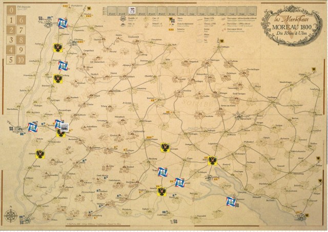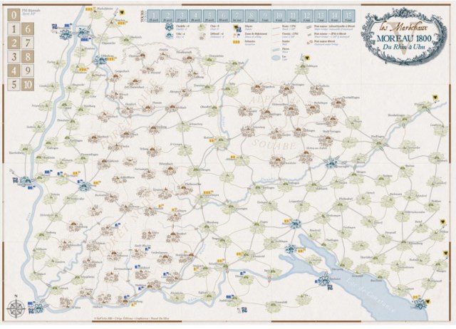 The scenario is a point-to-point map, a classic from Vae Victis campaigns, and the units are division level grouped in armies or army corps. One player commands the French army, with Saint-Cyr in the center, Sainte-Suzanne in the left-wing, Lecourbe in the right-wing and Moreau in the reserve. The other player commands the Austrian army, with Nauendorf in the center, Sztaray in the right-wing and Reuss in the left-wing.